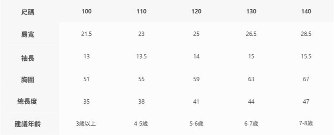 1. 尺寸表單位皆為公分(cm),實際尺寸會因布料彈性、水洗、測量起迄點等因素略有誤差。