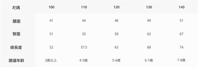 100號 [95~100cm]、110號 [100~110cm]、120號 [110~120cm]、130號 [120~130cm]、140號 [130~140cm]
