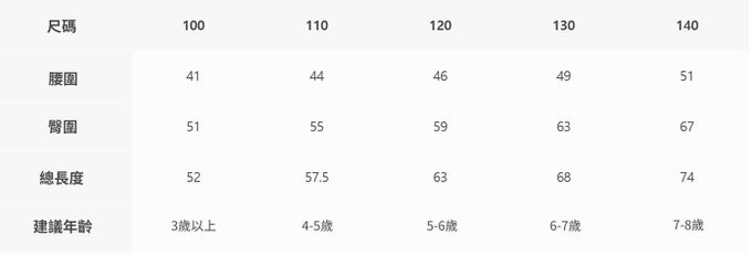 100號 [95~100cm]、110號 [100~110cm]、120號 [110~120cm]、130號 [120~130cm]、140號 [130~140cm]