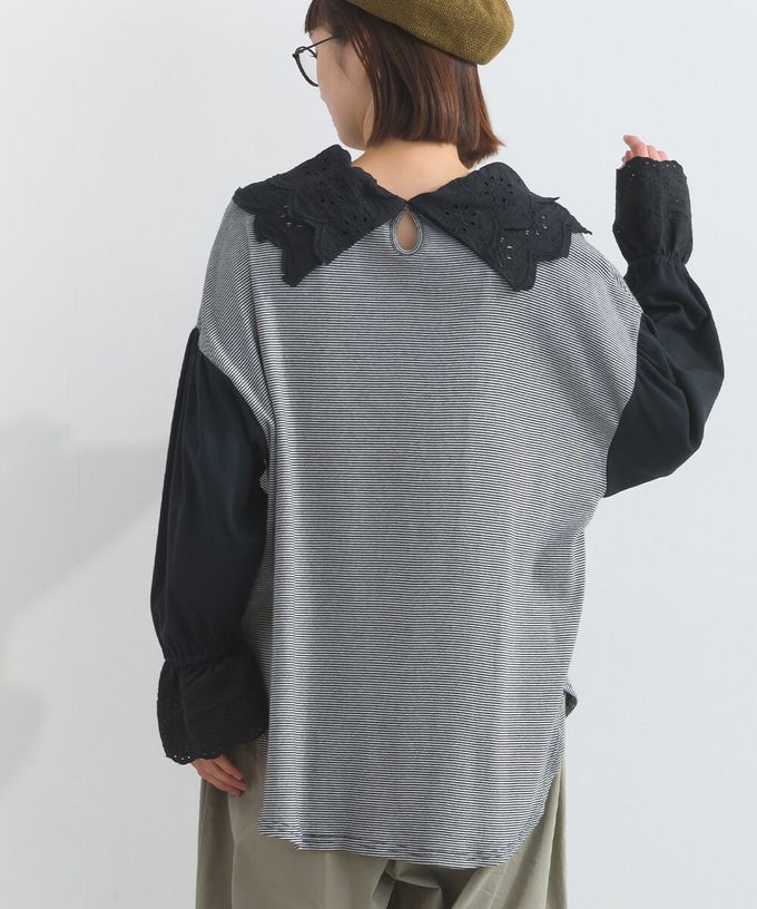 日本 Lupilien - 精緻蕾絲領落肩喇叭袖上衣-黑