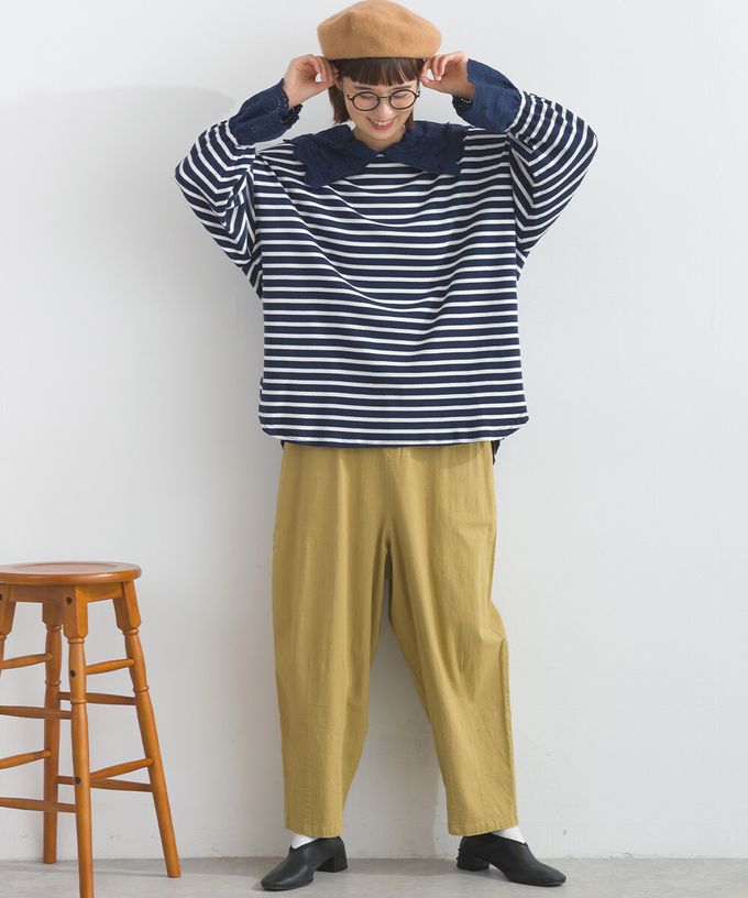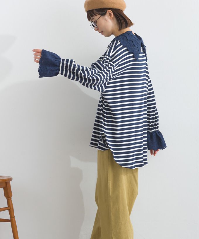 日本 Lupilien - 精緻蕾絲領落肩喇叭袖上衣-海軍藍條紋