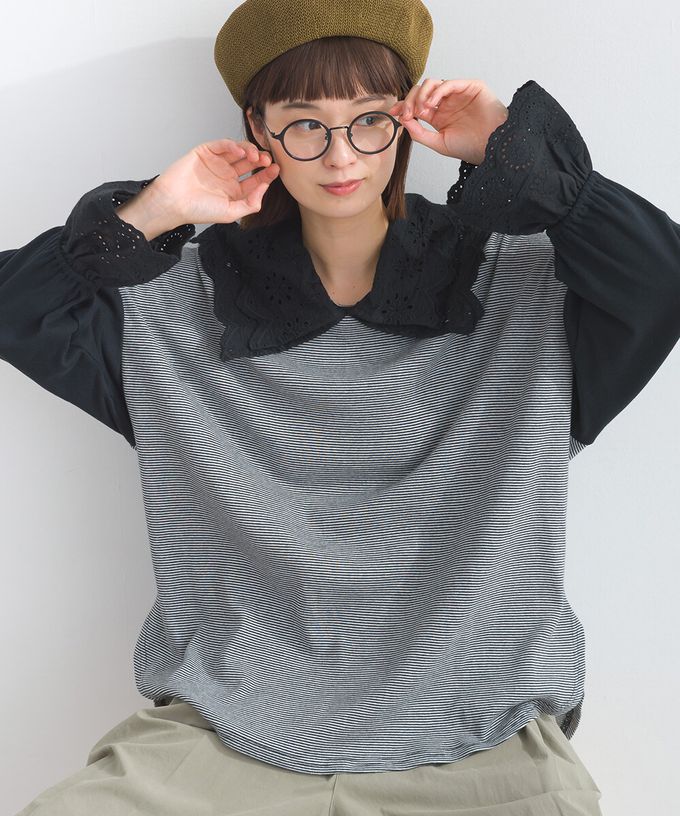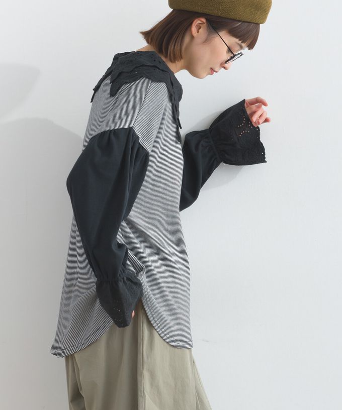 日本 Lupilien - 精緻蕾絲領落肩喇叭袖上衣-黑灰條紋