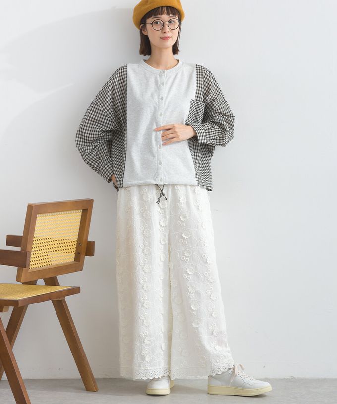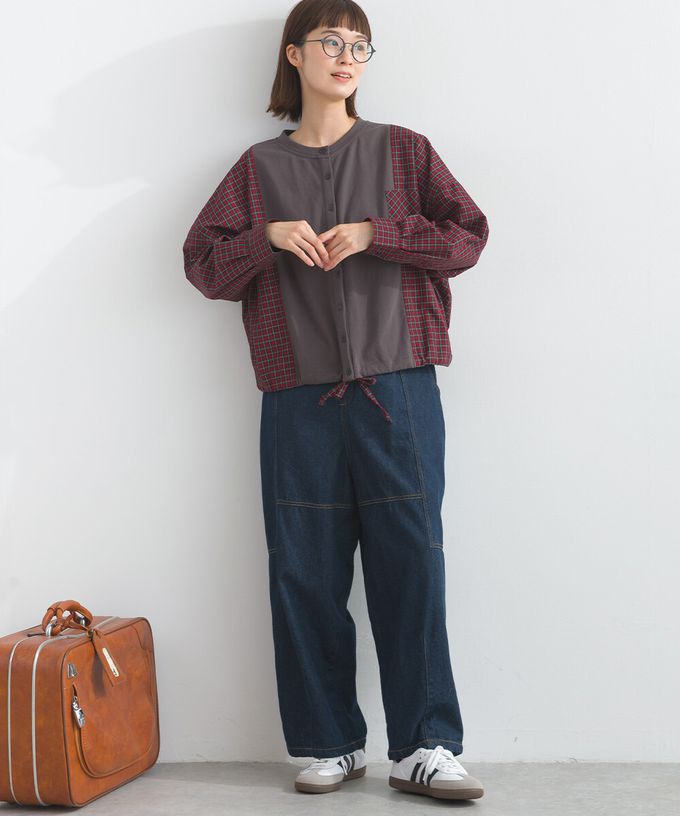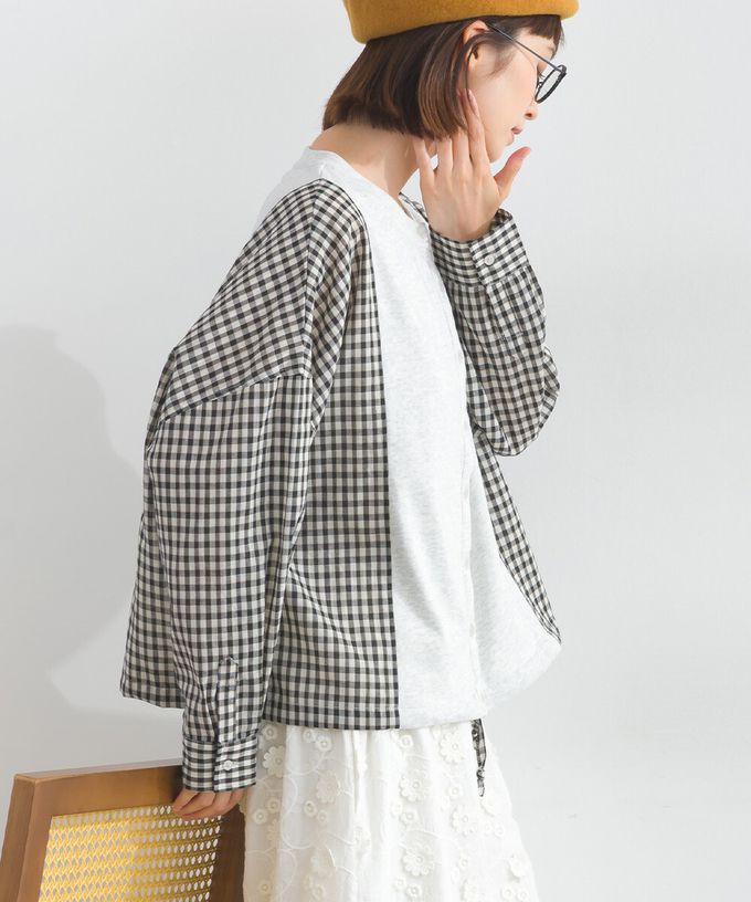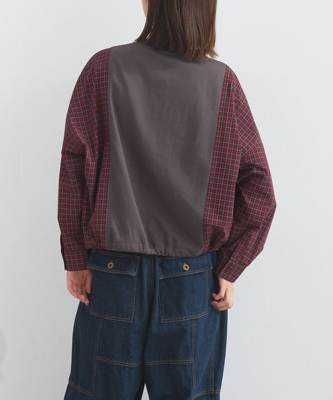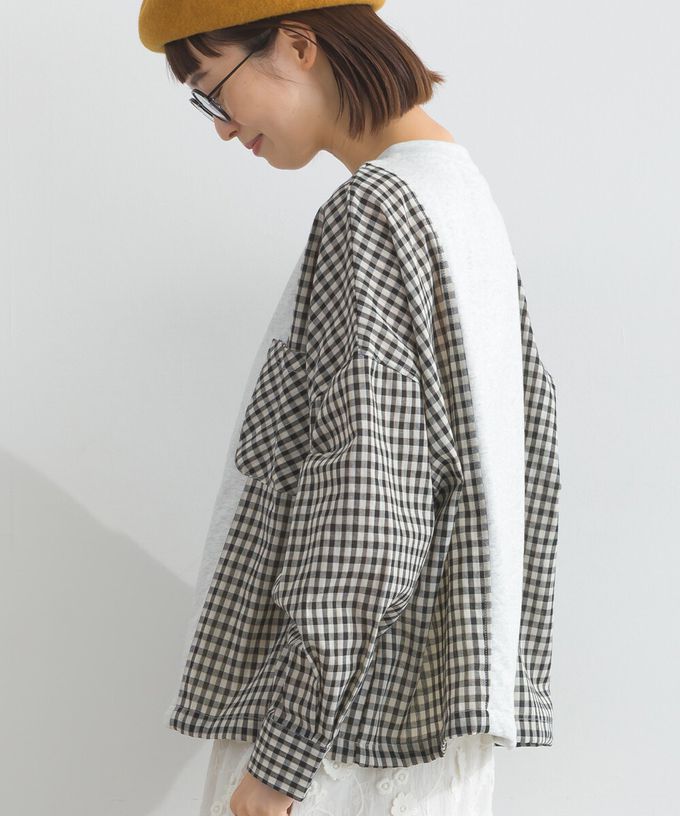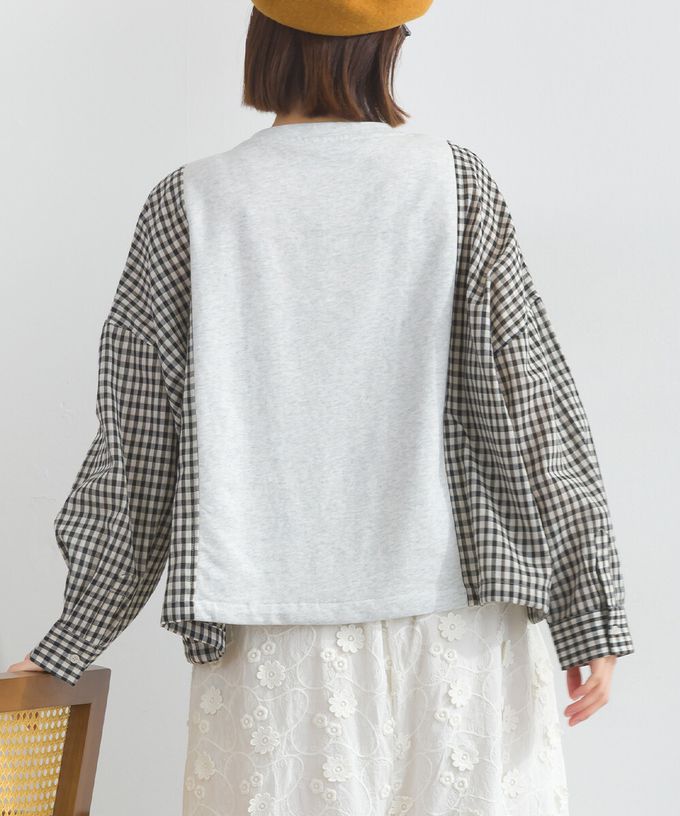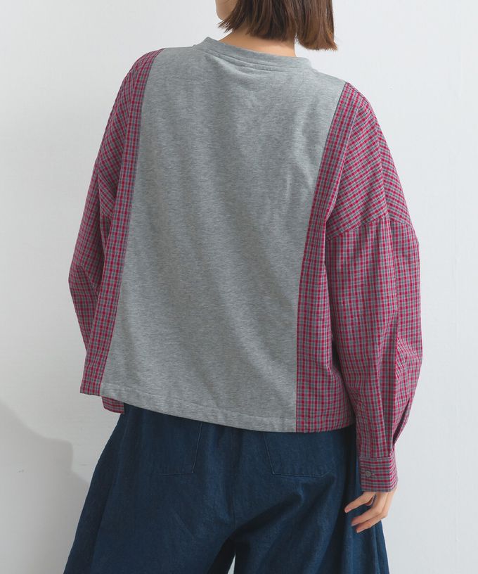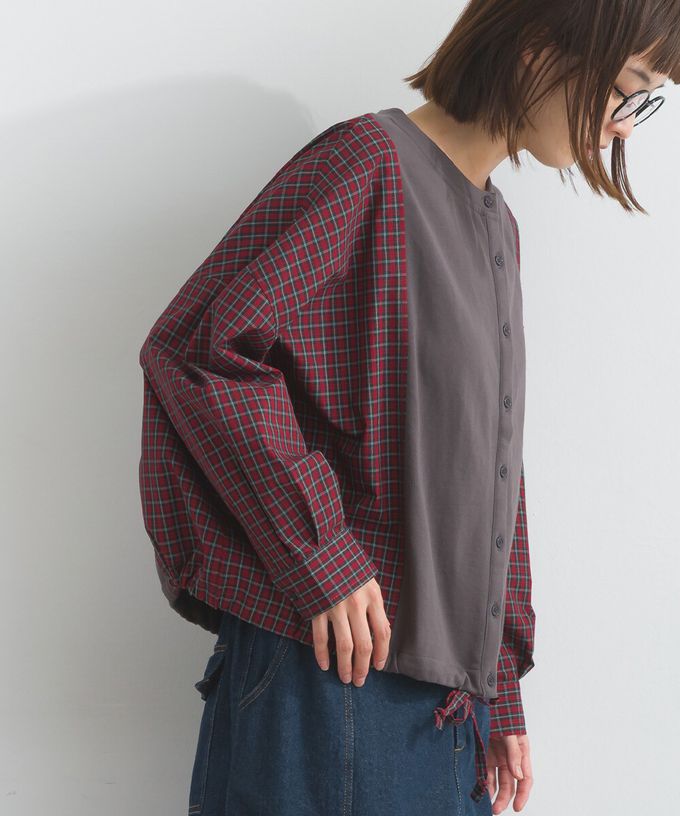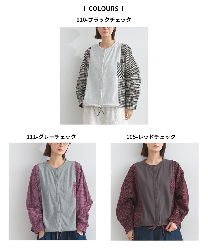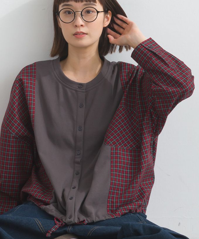 日本 Lupilien - 可愛格子拼接裏毛休閒襯衫-淺灰x紫