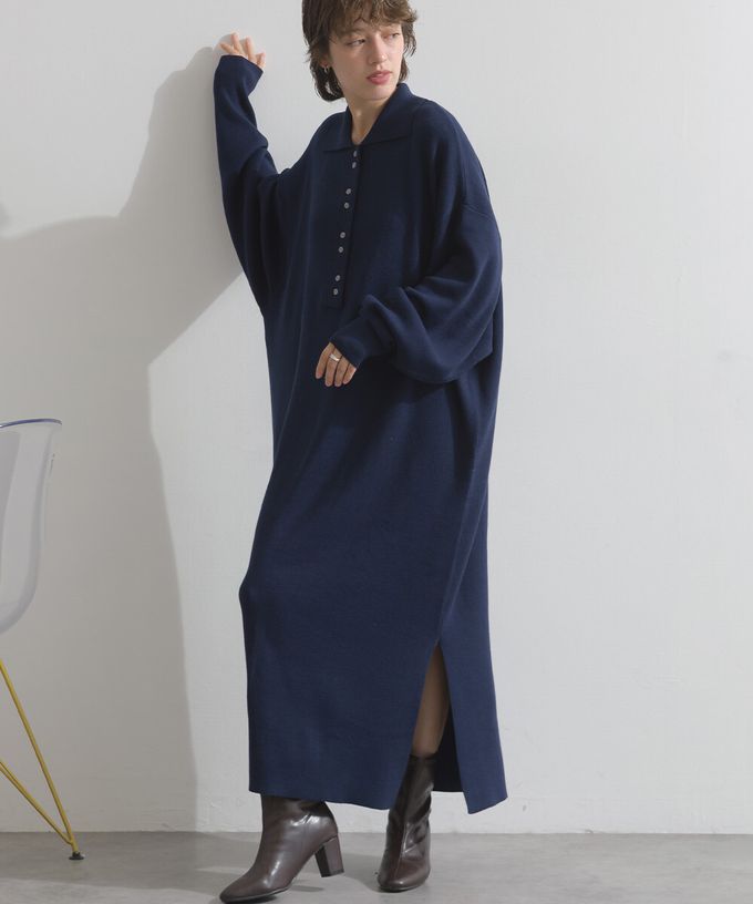 日本 Lupilien - 氣質排扣polo衫針織長袖洋裝-海軍藍