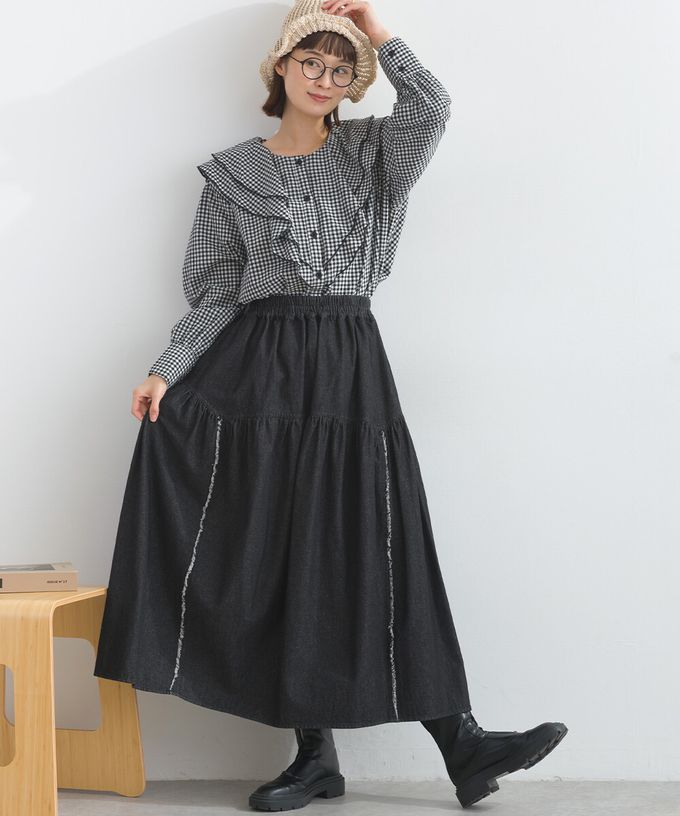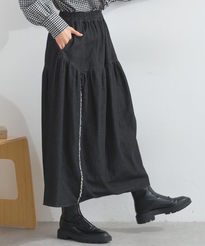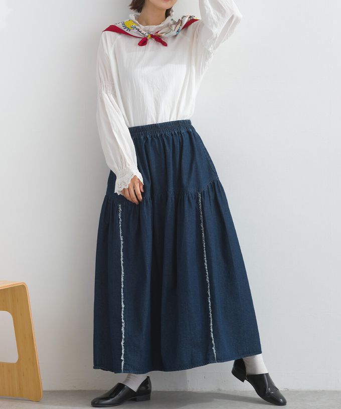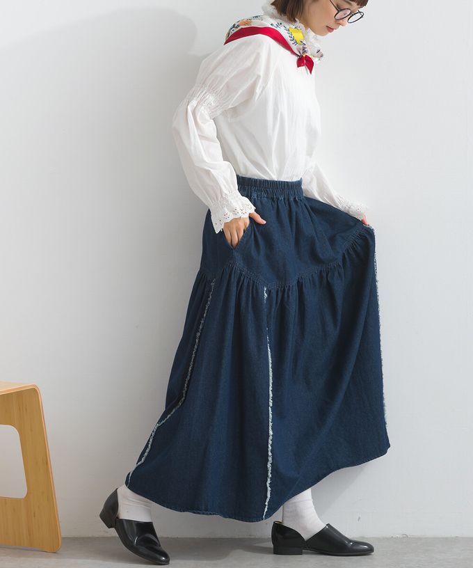 日本 Lupilien - 厚磅立體感線條澎澎長裙(附口袋)-海軍藍丹寧