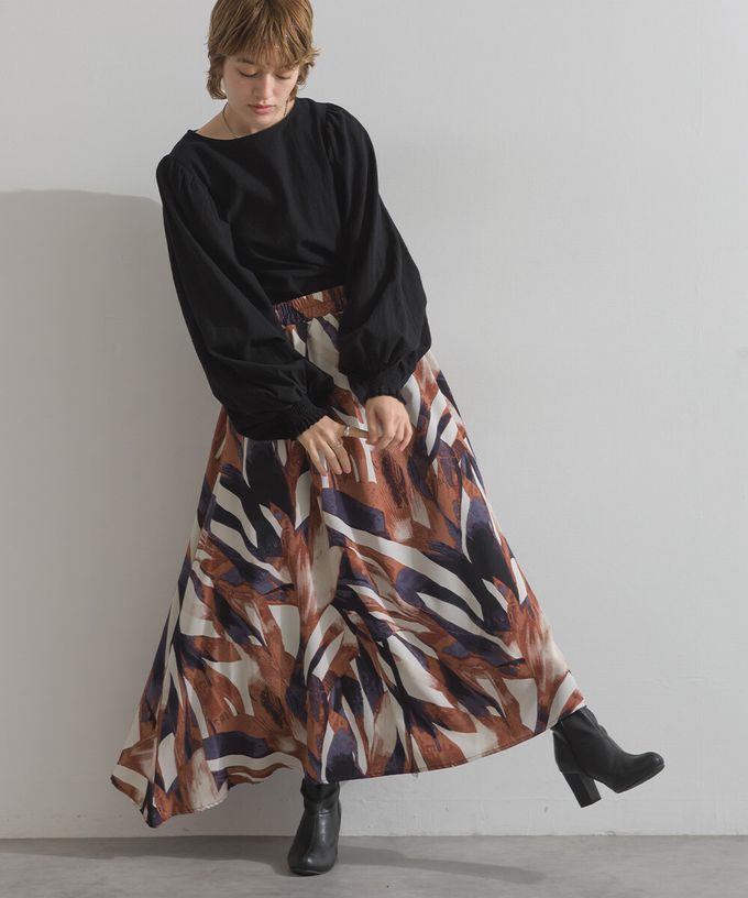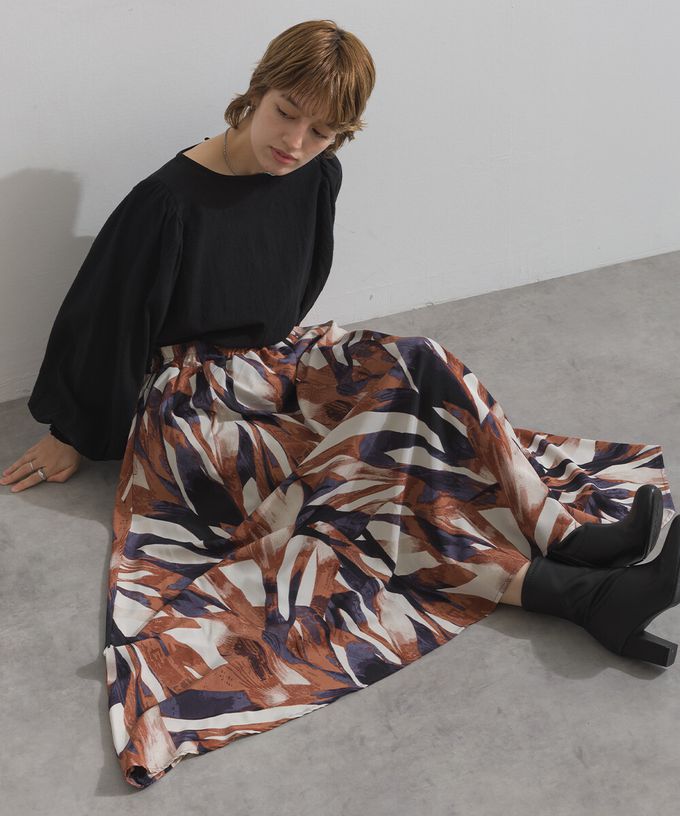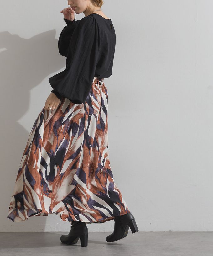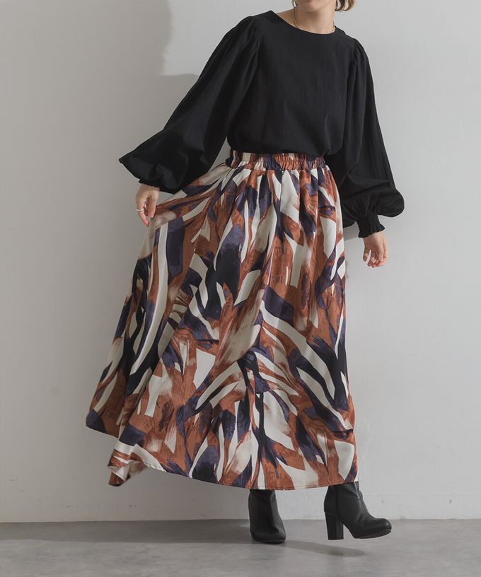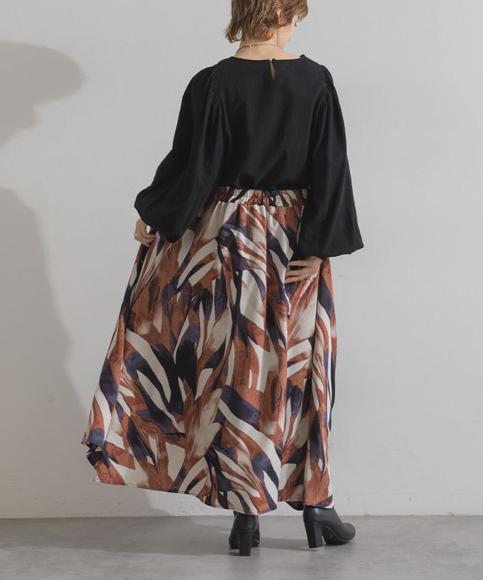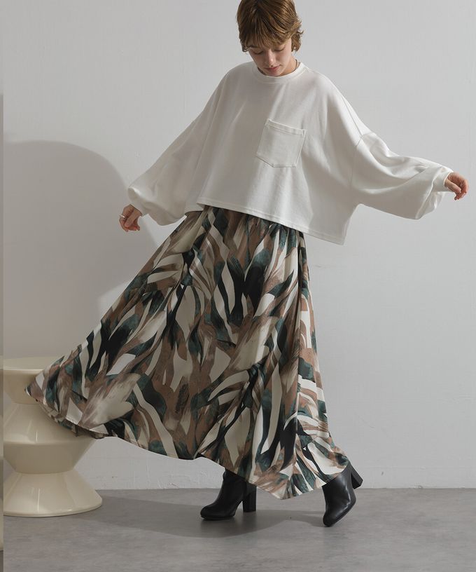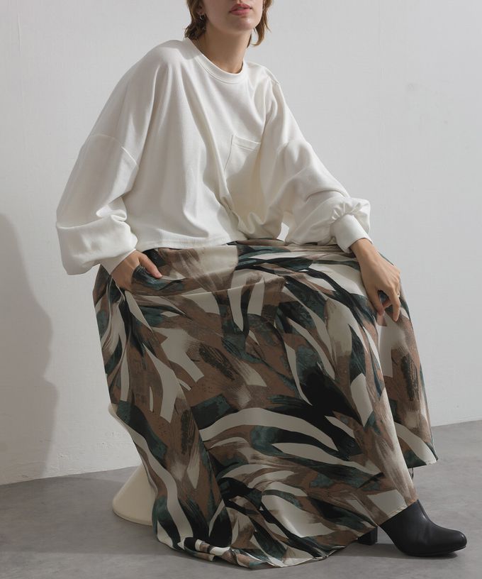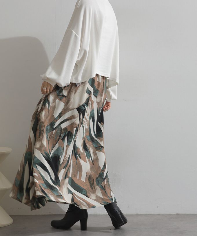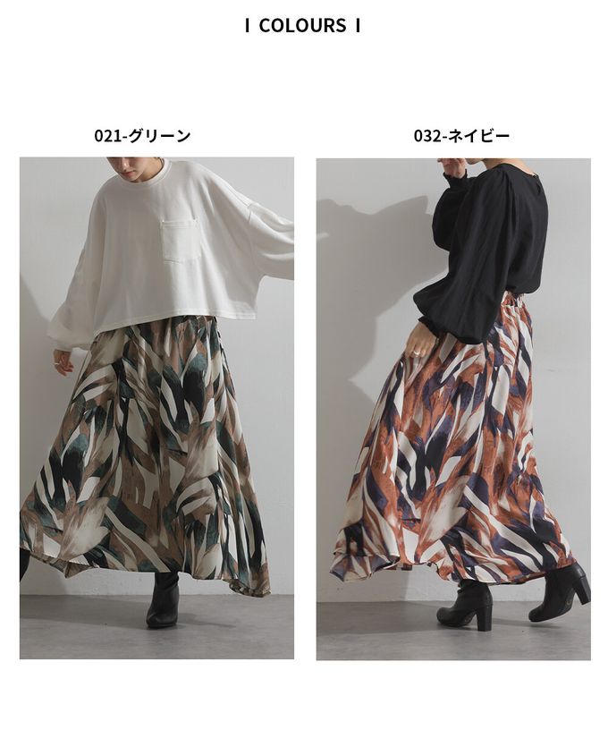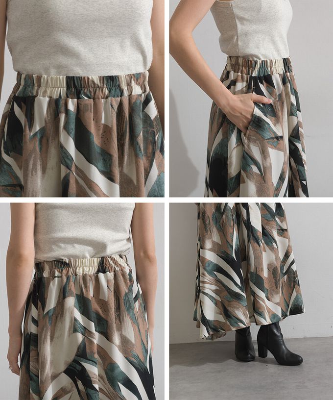 日本 Lupilien - 油畫線條感印花飄逸長裙(附口袋)-綠棕系