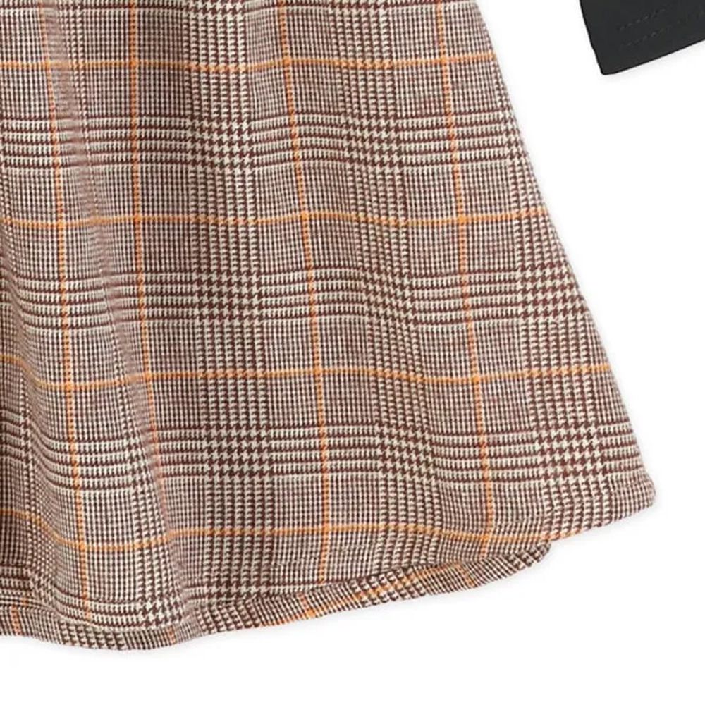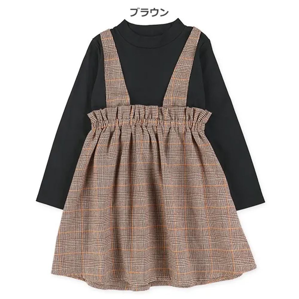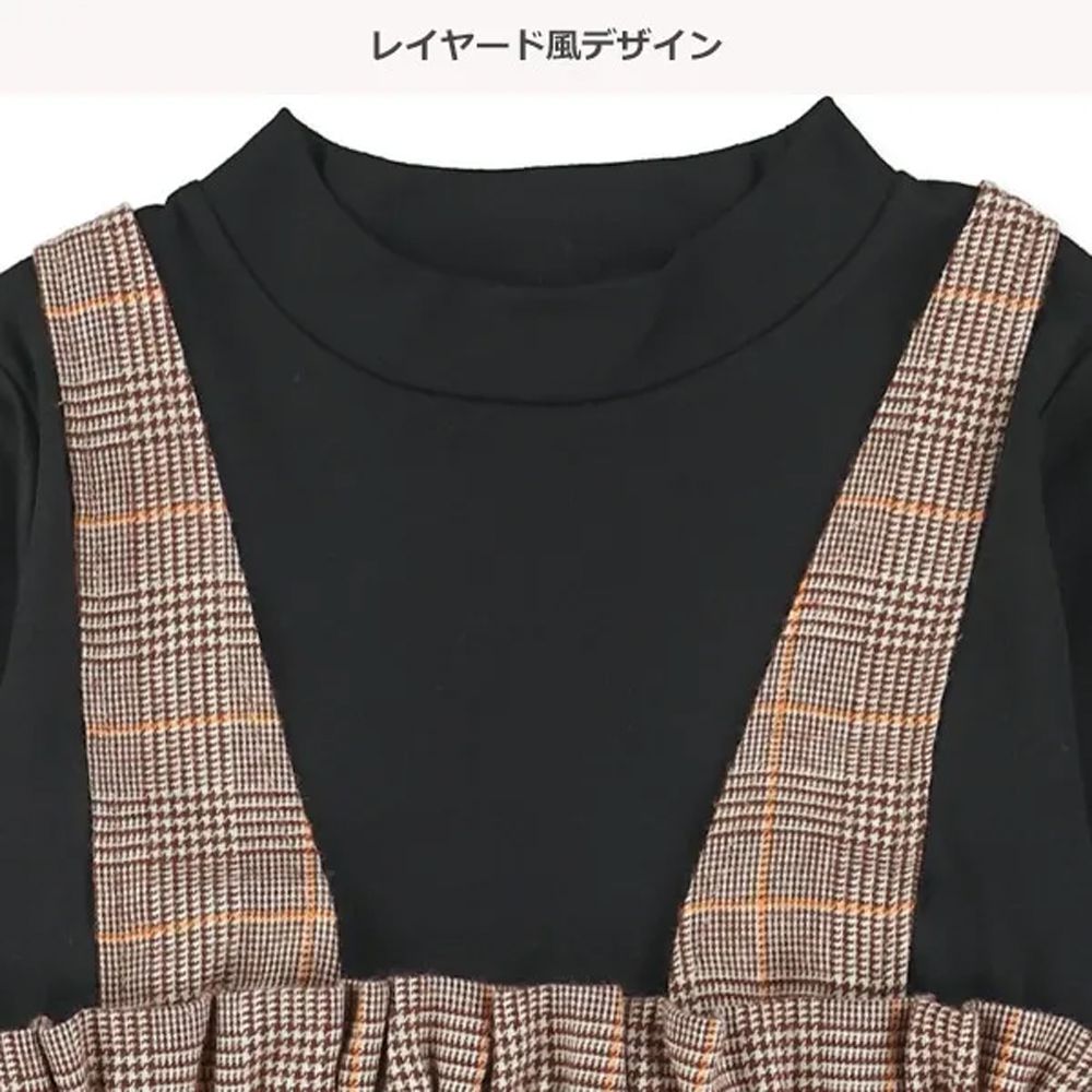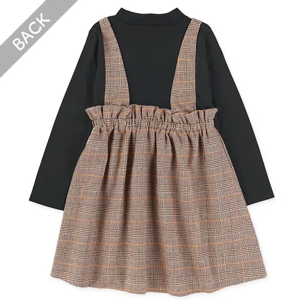日本西松屋 - 假兩件式格紋吊帶長袖洋裝-黑X棕
