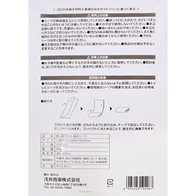 使用方式:●請將防水保潔墊完全攤開,並用膠帶固定。●將弄髒的部分向內捲起,以保持衛生。●請勿丟入馬桶。●丟棄時請遵循各地方環保局的規定處理。 〈丟棄方式〉①將弄髒的部分向內折起。②捲起後用膠帶固定。