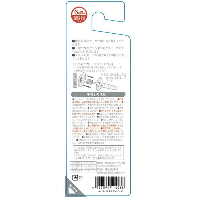 注意事項:●使用前請先閱讀本說明書,並在使用期間妥善保管。●請勿作為其他用途使用。●使用時,務必請家長陪同,監看孩子的使用狀況。●請套上安全擋片後再使用。●本產品為乳齒用牙刷,請勿用於其他用途。●請勿放置在火源旁。●使用前請先清洗乾淨。●請勿當作奶嘴、固齒器使用。●使用時若發現幼童有任何異狀,請立即停止使用。●不可旋轉,請以正常的方式刷牙。●過度用力刷牙可能會對牙齦造成傷害。●幼童刷完後,請家長或大人務必再幫幼童刷一遍。●因可能會造成掉毛或變質、變形等情況發生,請勿使用熱水或消毒液消毒。●使用後請盡速清洗,並保持清潔。●請勿使用已受損或變形的產品。●依刷毛狀況更換牙刷,基於衛生考量建議每1~2個月更換一次。●刷毛部分若長時間或用力啃咬、拉扯,可能導致損壞。請以正確的方式刷牙。●請勿讓幼童含著牙刷奔跑或玩耍,以免發生意外。●耐熱溫度90℃