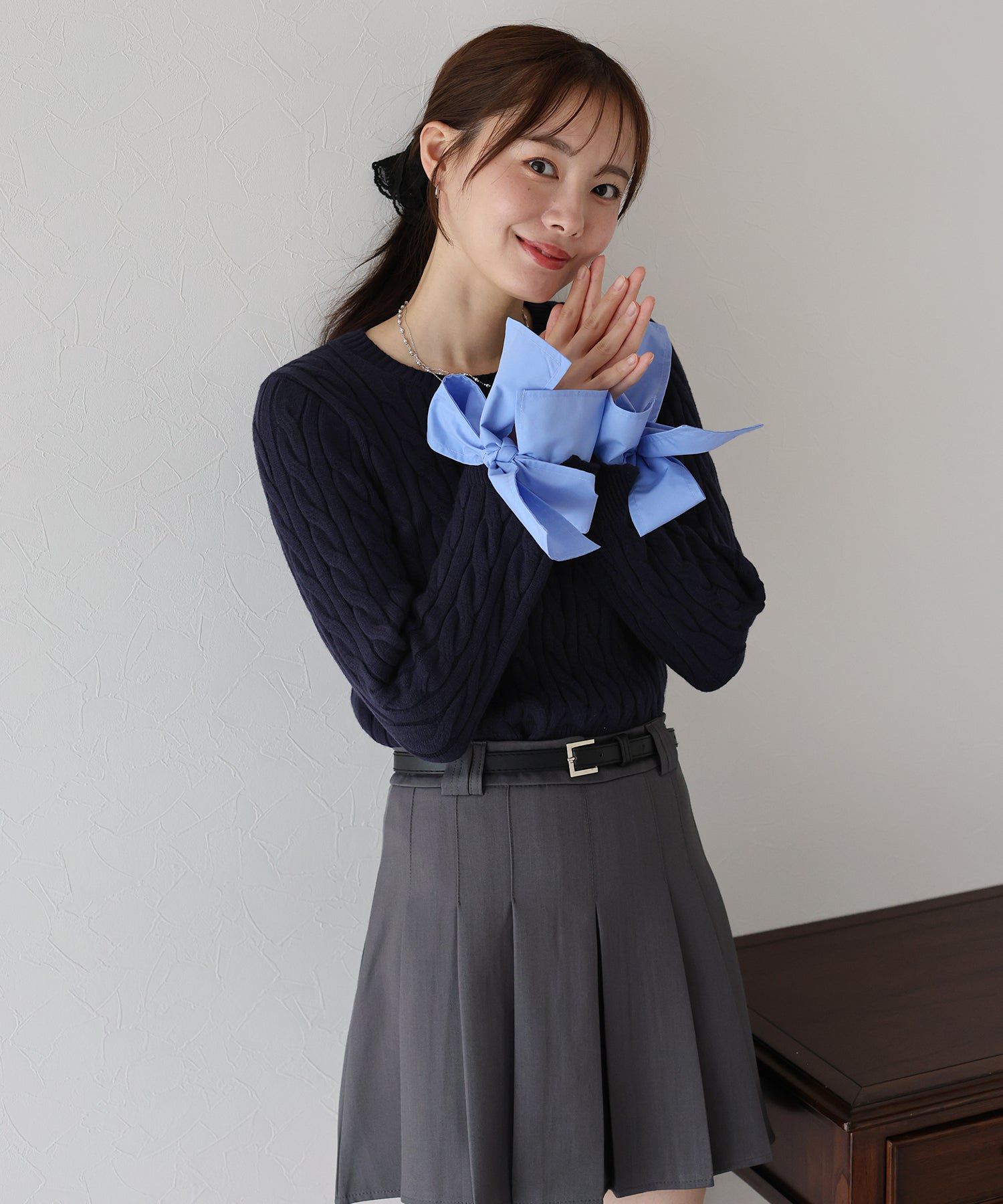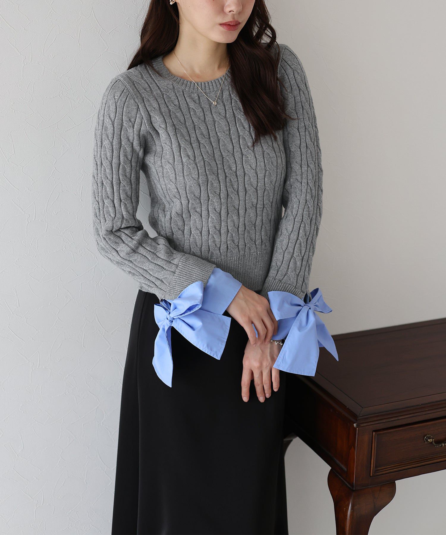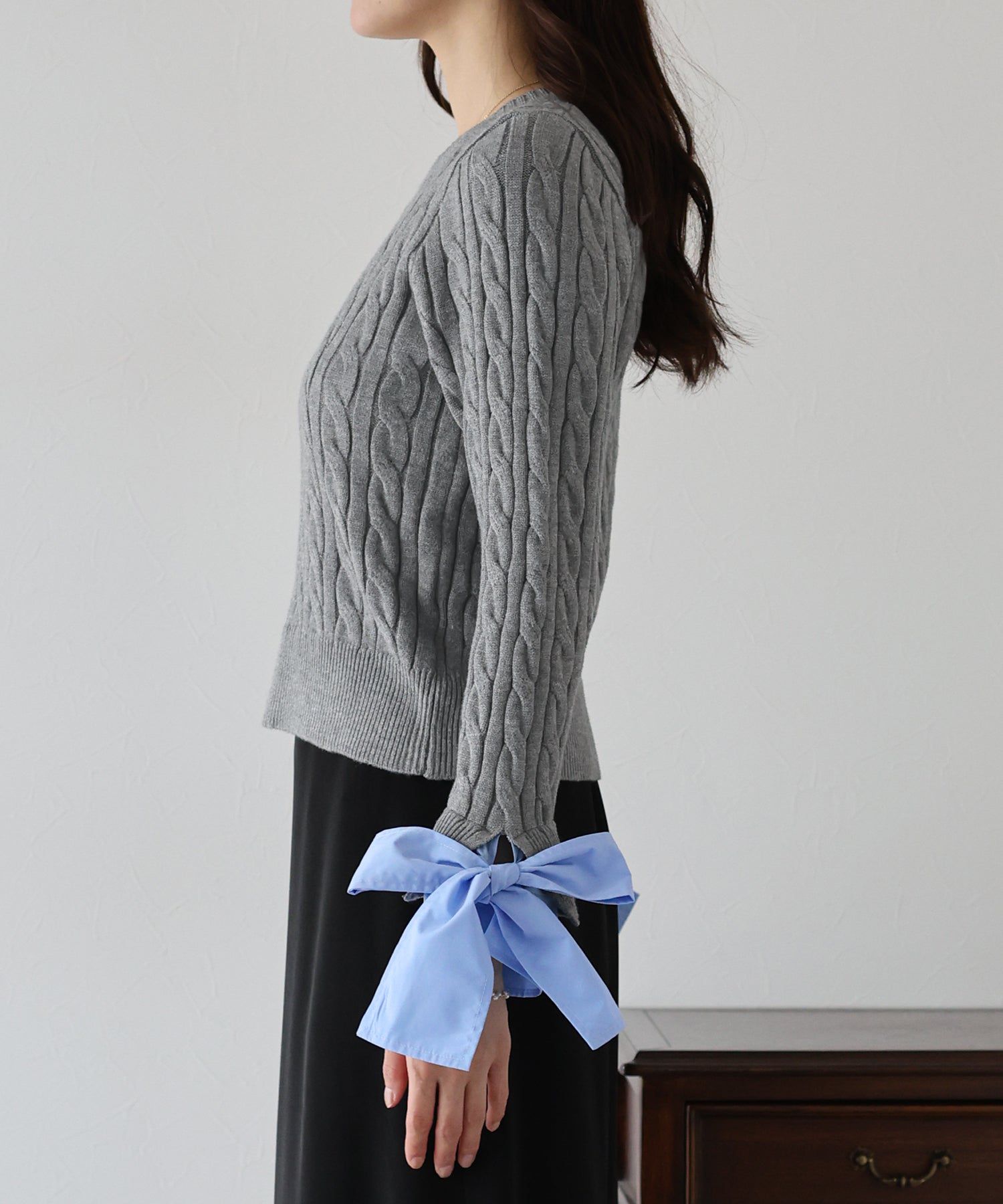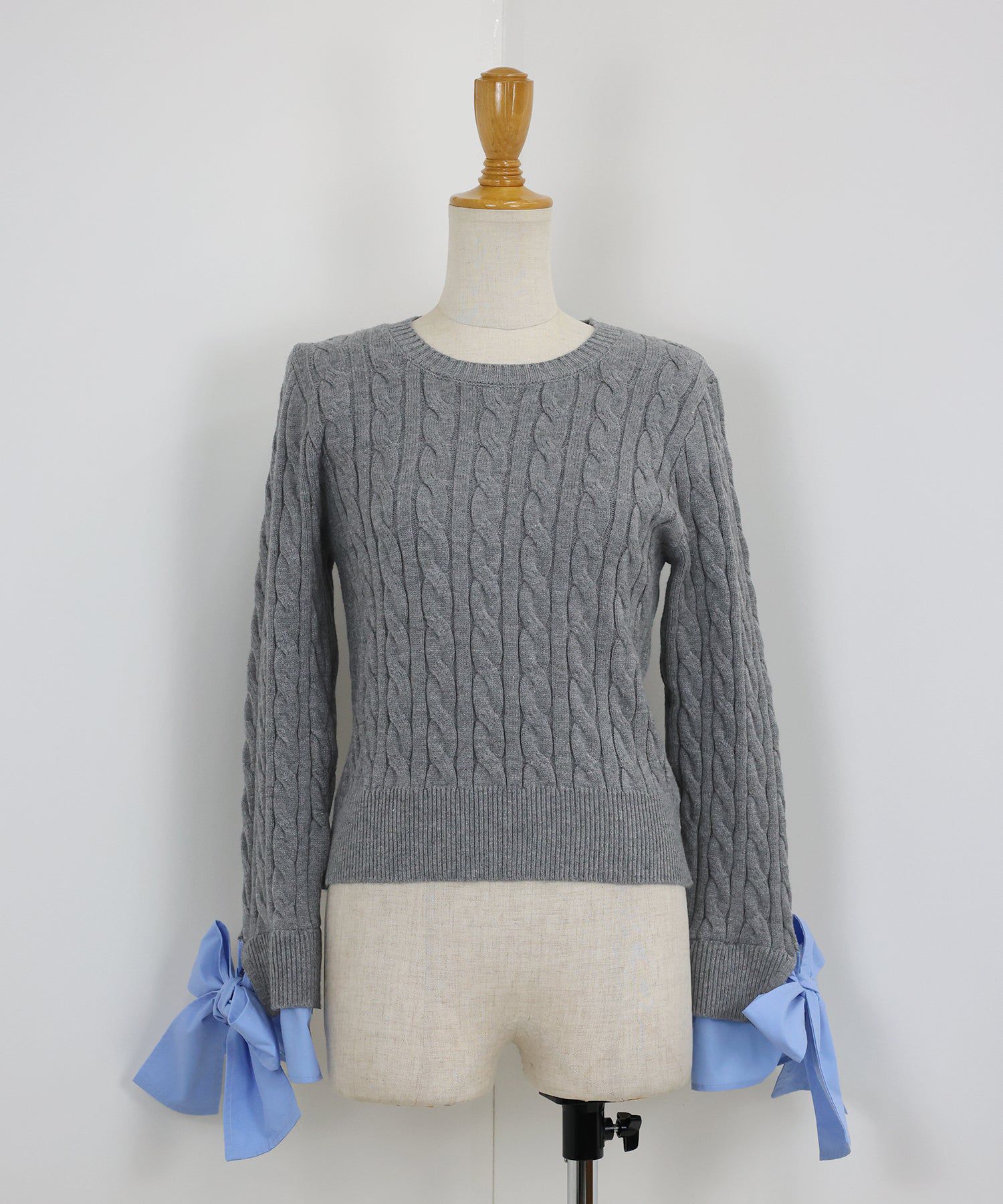 日本 BLUE EAST - 亮麗蝴蝶結緞帶袖麻花針織上衣-灰