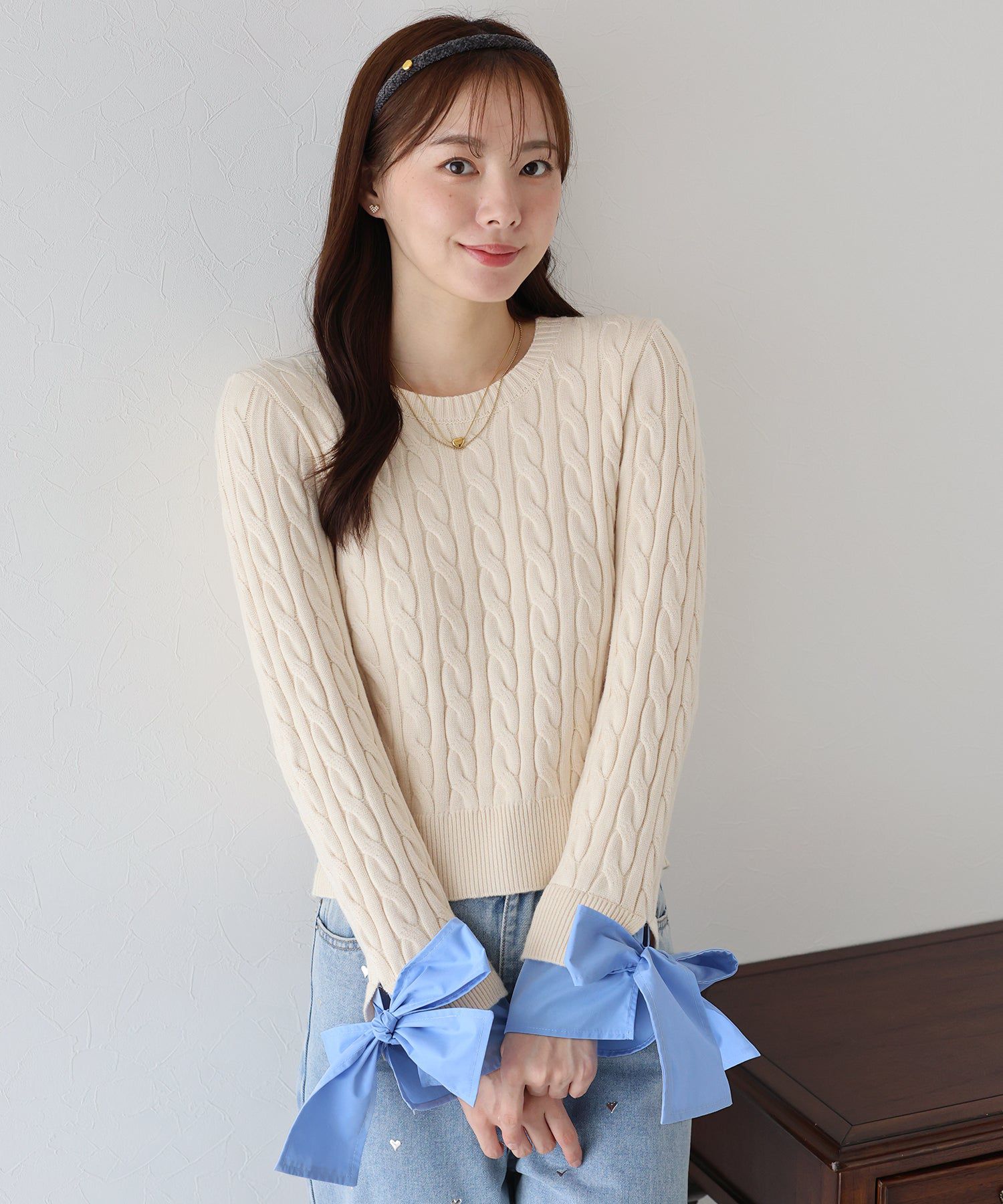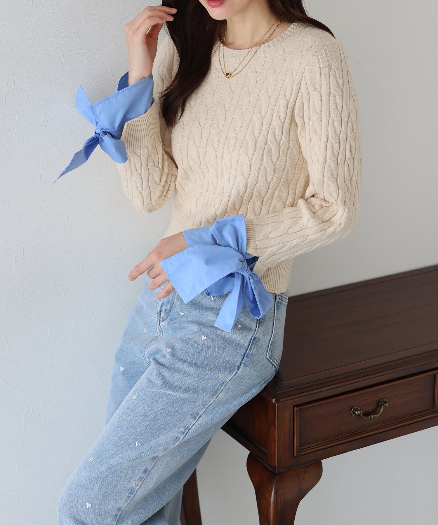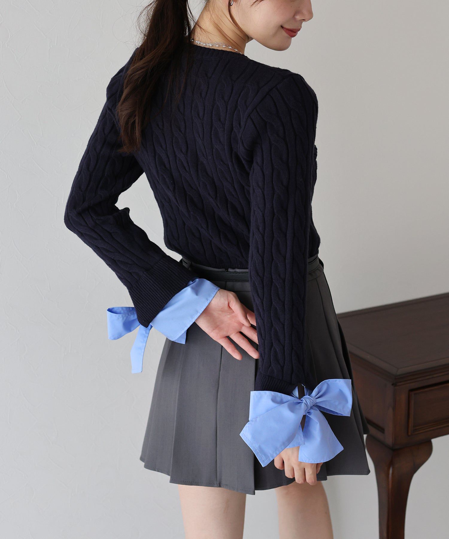 • 品名:亮麗蝴蝶結緞帶袖麻花針織上衣