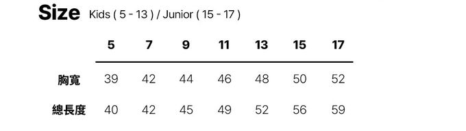 1. 尺寸表單位皆為公分(cm),實際尺寸會因布料彈性、水洗、測量起迄點等因素略有誤差。建議參考孩子平時穿著衣物尺寸進行選購。