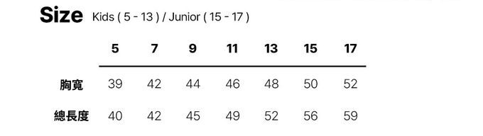 1. 尺寸表單位皆為公分(cm),實際尺寸會因布料彈性、水洗、測量起迄點等因素略有誤差。建議參考孩子平時穿著衣物尺寸進行選購。