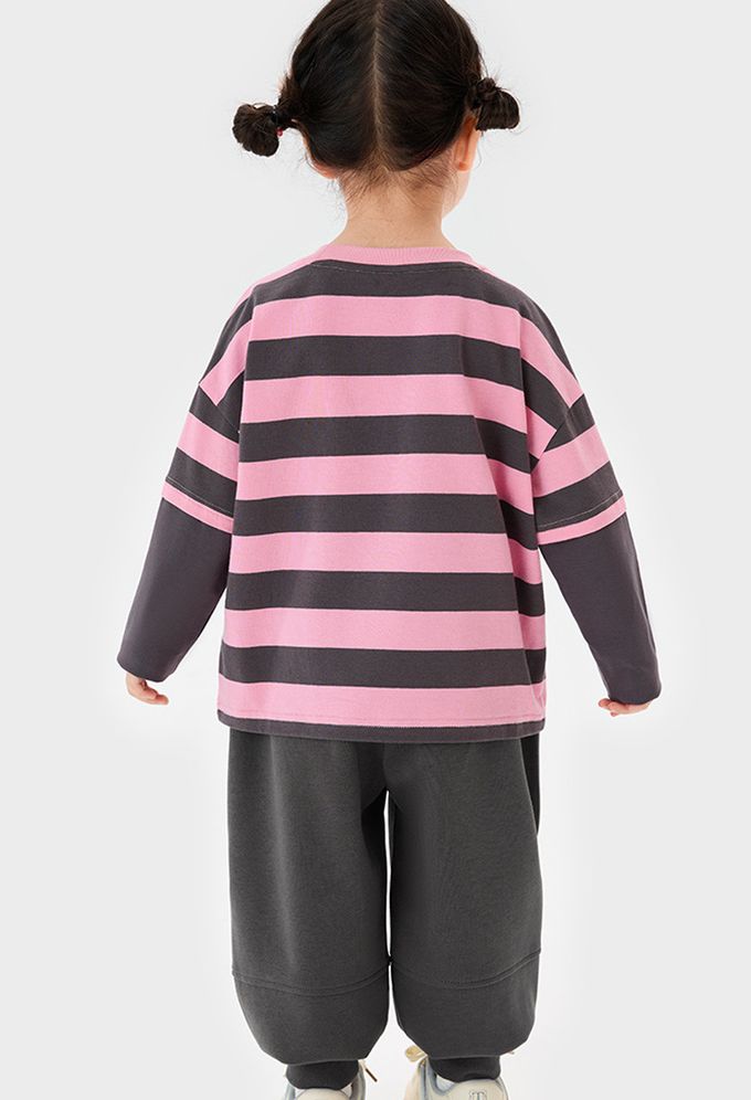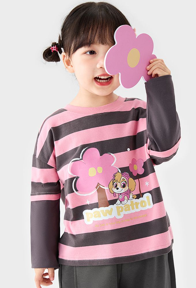 卡通汪汪隊假兩件長袖上衣-卡通人物天天-粉色條紋