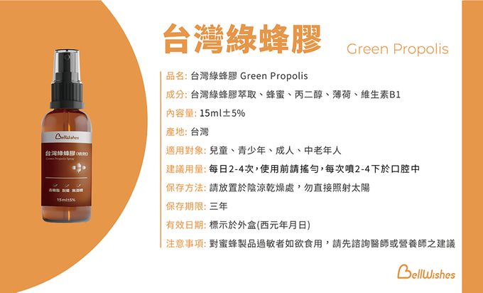 成分:台灣綠蜂膠萃取、蜂蜜、丙二醇、薄荷、維生素B1