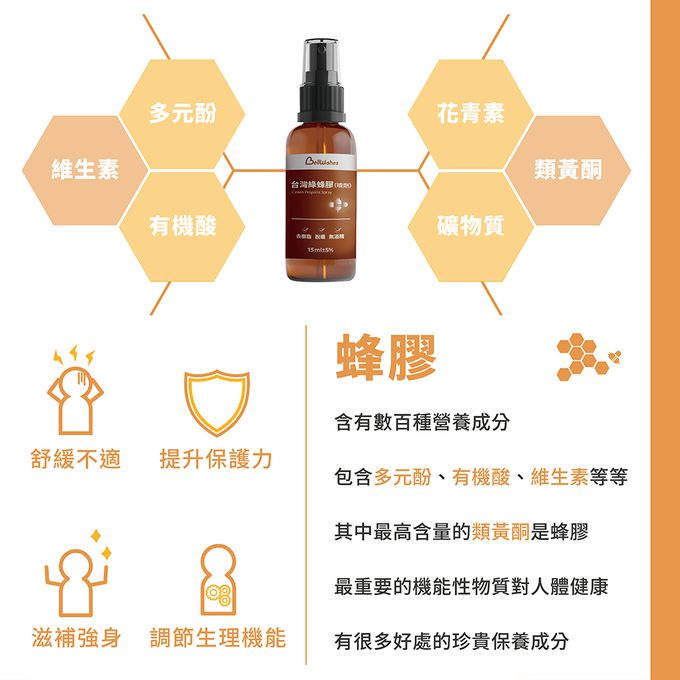 蜂膠含有數百種營養成分,包含多元酚、有機酸、維生素等等