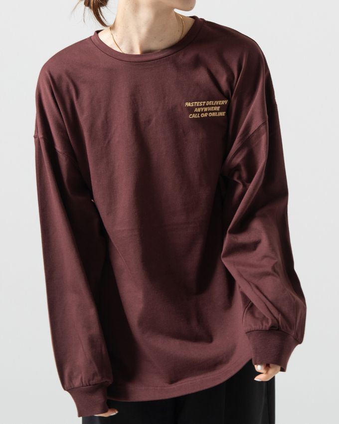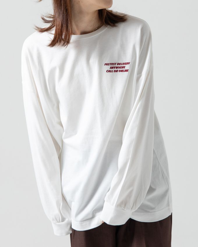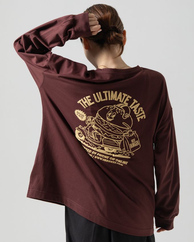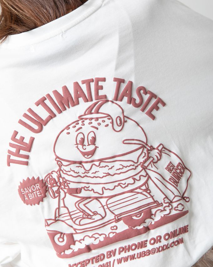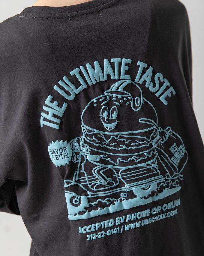 這款長袖T恤以獨特的外送漢堡插畫搭配立體泡泡印花,視覺效果搶眼。蓬鬆的標誌與插畫印花,簡單卻充滿個性。寬鬆版型與落肩設計兼具舒適感與時尚感,一件就能打造活潑有趣的穿搭風格。