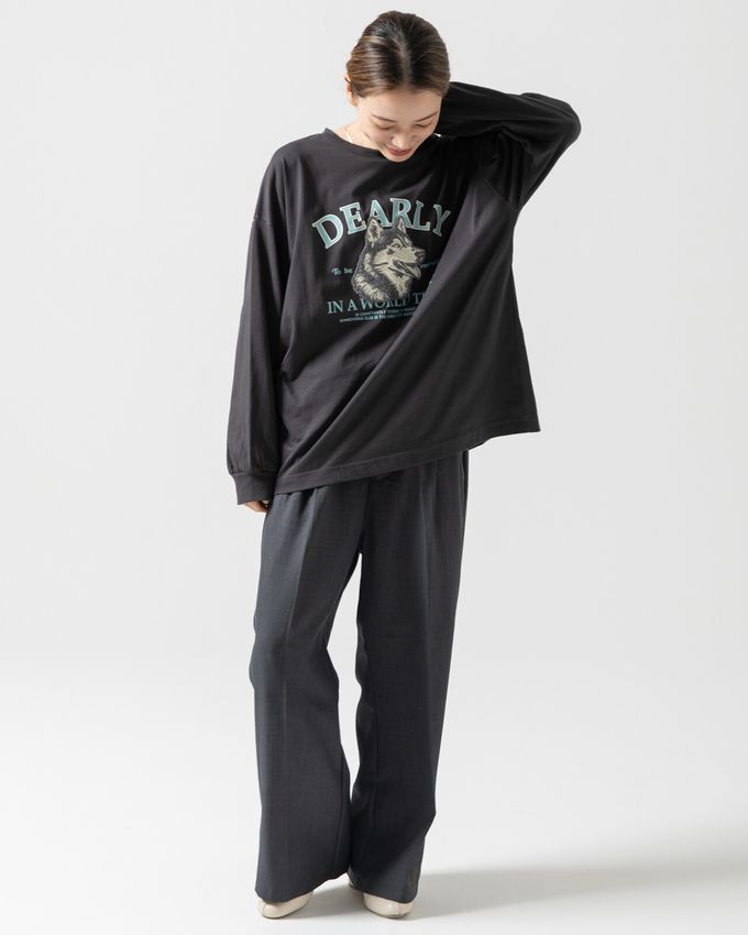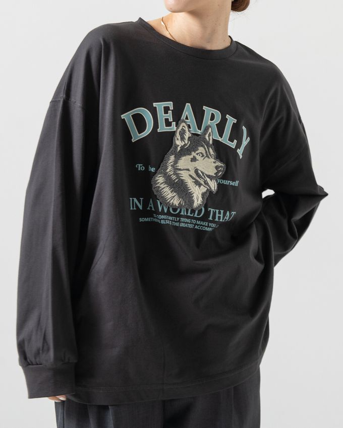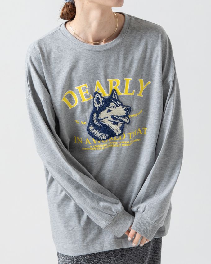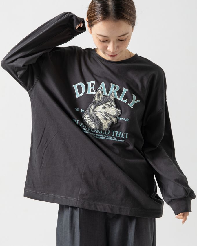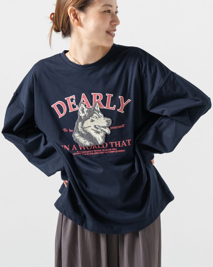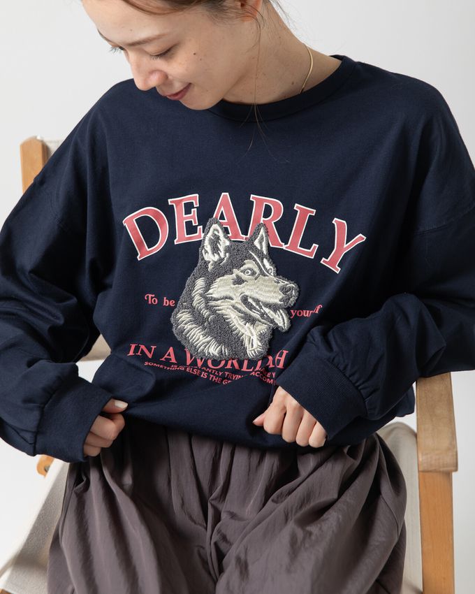 這款長袖T恤以柔軟的相良刺繡呈現可愛的哈士奇造型,充滿視覺張力。結合立體刺繡與學院風格的Logo印花,打造兼具趣味與休閒感的設計。寬鬆身幅與落肩大版型,提供舒適穿著及流行,一件即可成為穿搭主角的獨特單品。