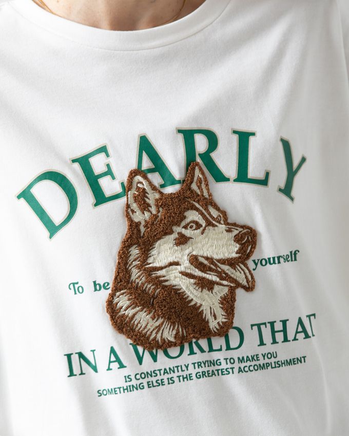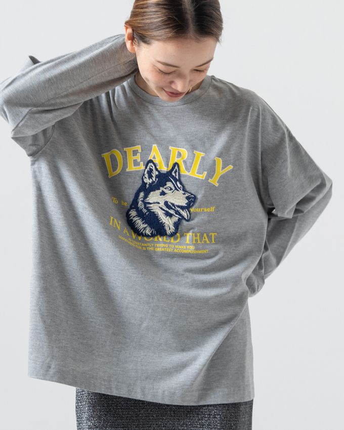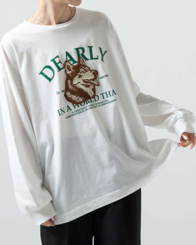 這款長袖T恤以柔軟的相良刺繡呈現可愛的哈士奇造型,充滿視覺張力。結合立體刺繡與學院風格的Logo印花,打造兼具趣味與休閒感的設計。寬鬆身幅與落肩大版型,提供舒適穿著及流行,一件即可成為穿搭主角的獨特單品。
