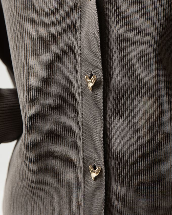 簡約設計中加入可愛圓潤的愛心鈕釦作為亮點。片絨編織的蓬鬆針織布料,營造柔和感。落肩設計與寬鬆身幅,讓穿著更舒適。袖口與下擺採用羅紋收邊,打造層次剪裁效果。也可以將鈕釦扣上,像穿套頭衫一樣展現不同風格。