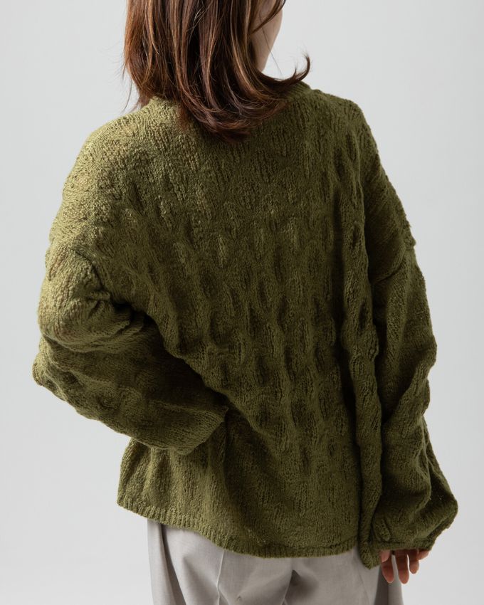 採用柔軟毛海材質,搭配透膚針織,展現輕盈感與層次美。蓬鬆寬鬆的粗針織增加視覺上的可愛厚度感。圓領設計不緊貼脖頸,搭配寬鬆版型,穿上即可展現時尚。透膚效果也適合與內搭層疊穿出豐富造型,是一件主角級針織單品。