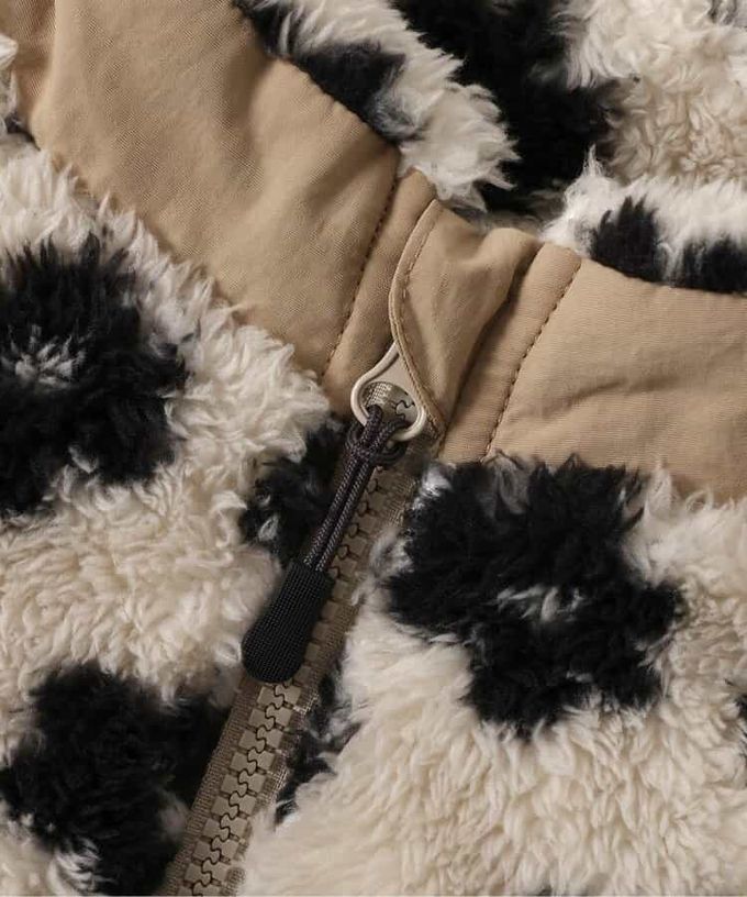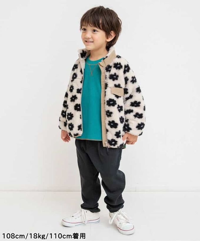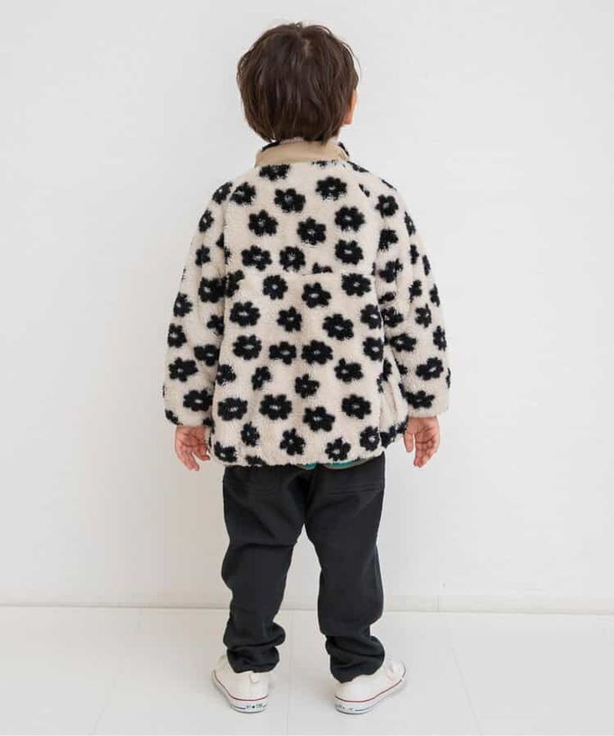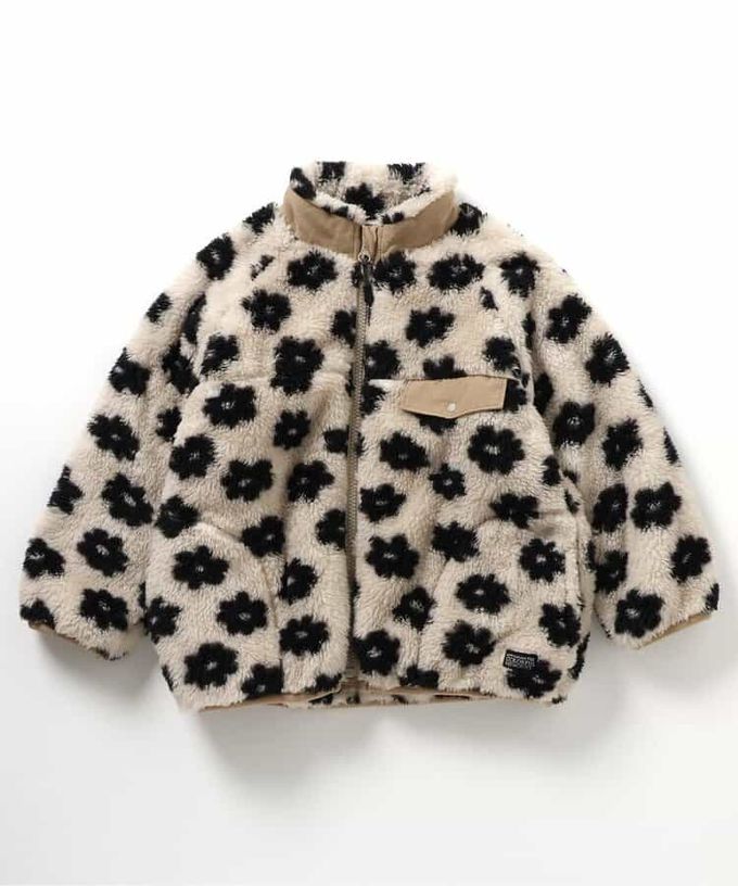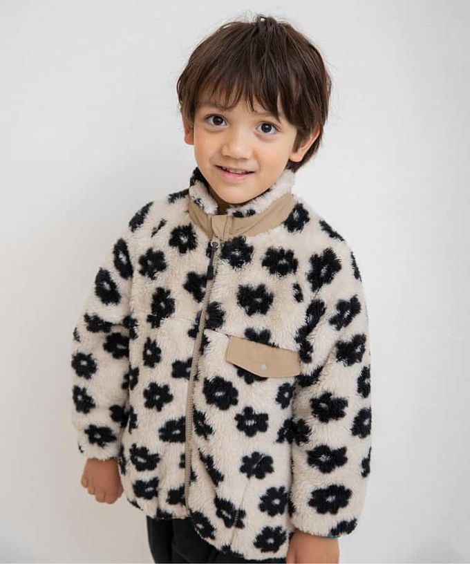 日本 BREEZE - 休閒保暖絨毛外套/夾克-花朵-米白X黑