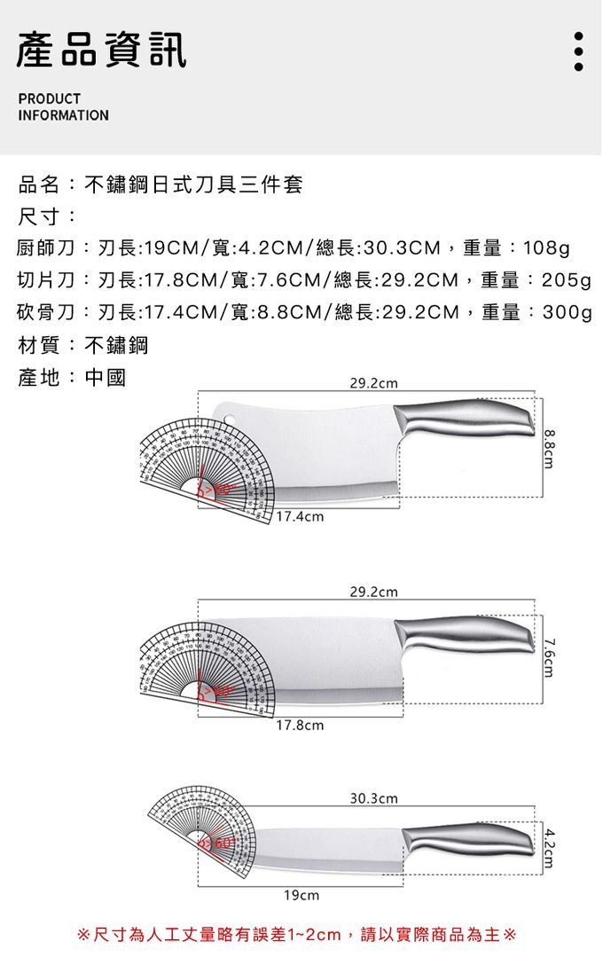 品名:不鏽鋼日式刀具三件套 廚師刀 切片刀 砍骨刀