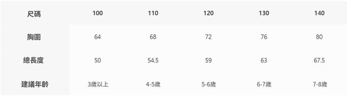 2. 尺寸表乃依平均值制定,每位孩童發育情形不同,請參考模特試穿資訊、既有衣物等,並依實際測量結果為準。