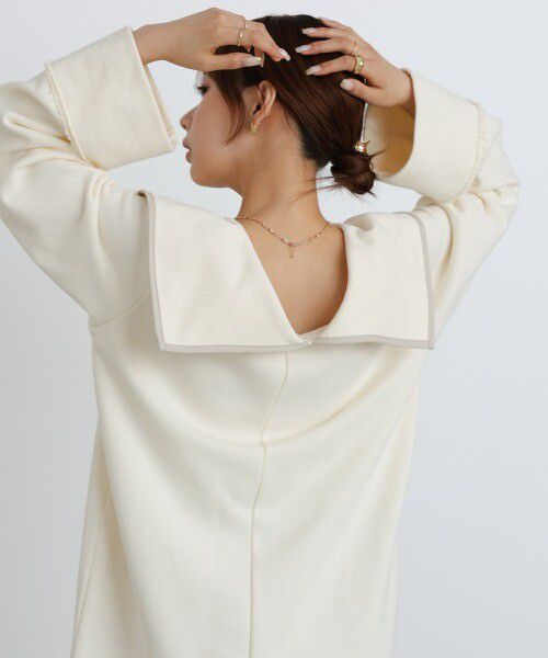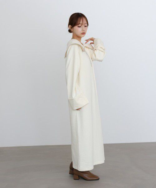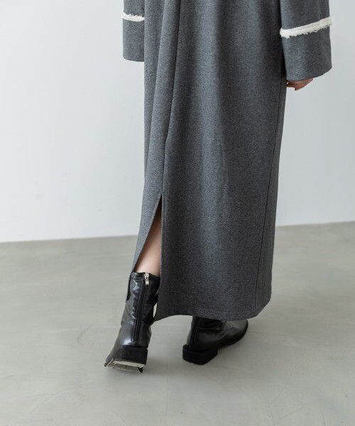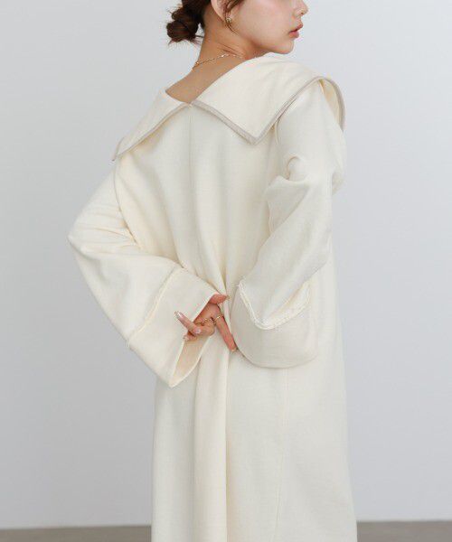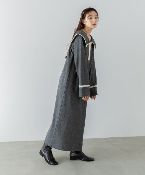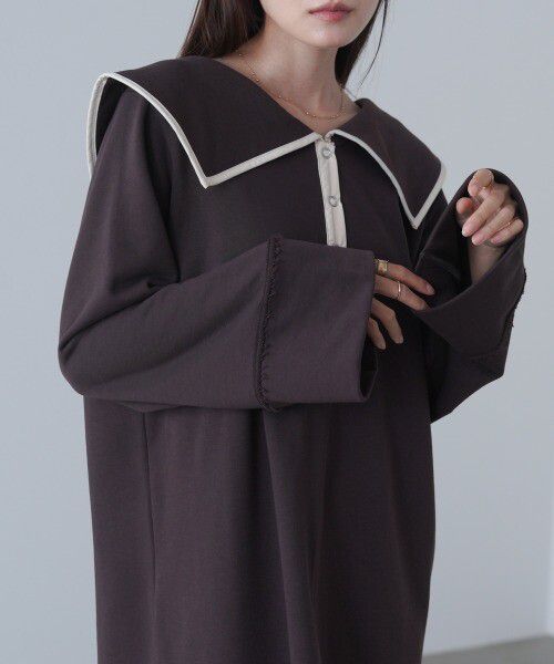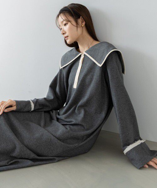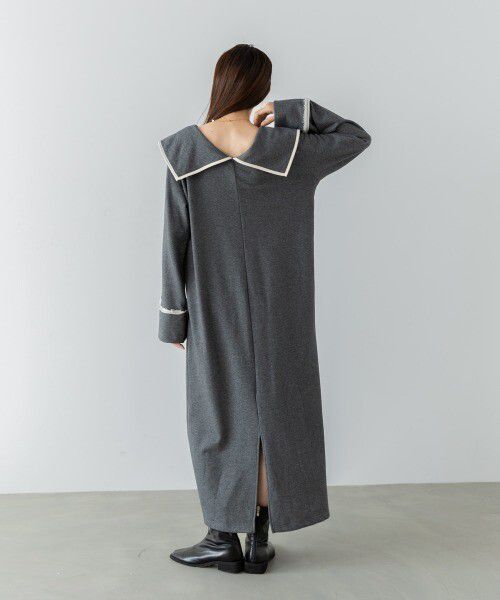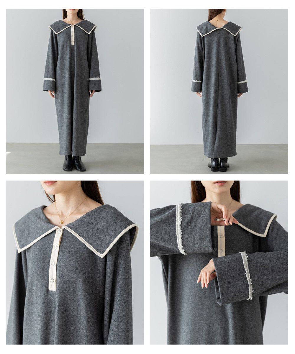 日本 Bab - 滾邊個性大翻領休閒長袖洋裝-深灰
