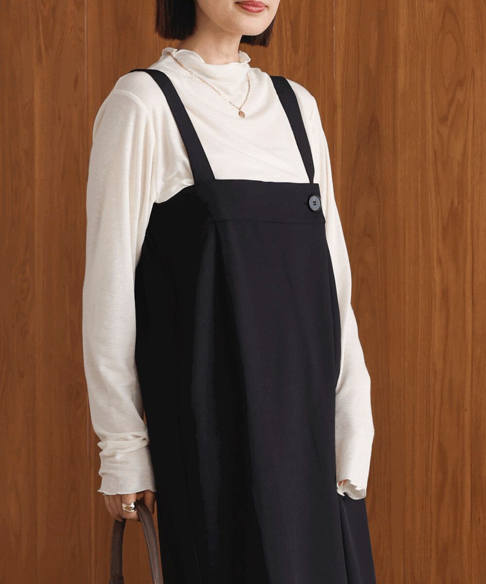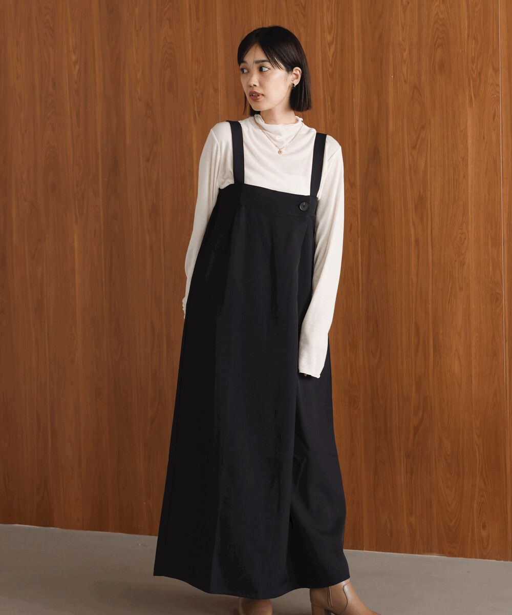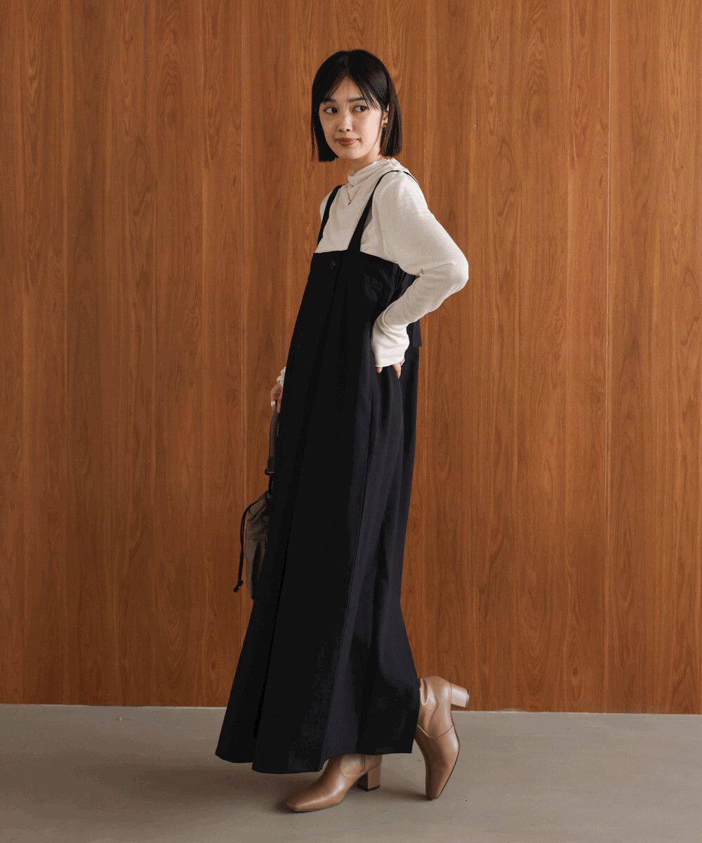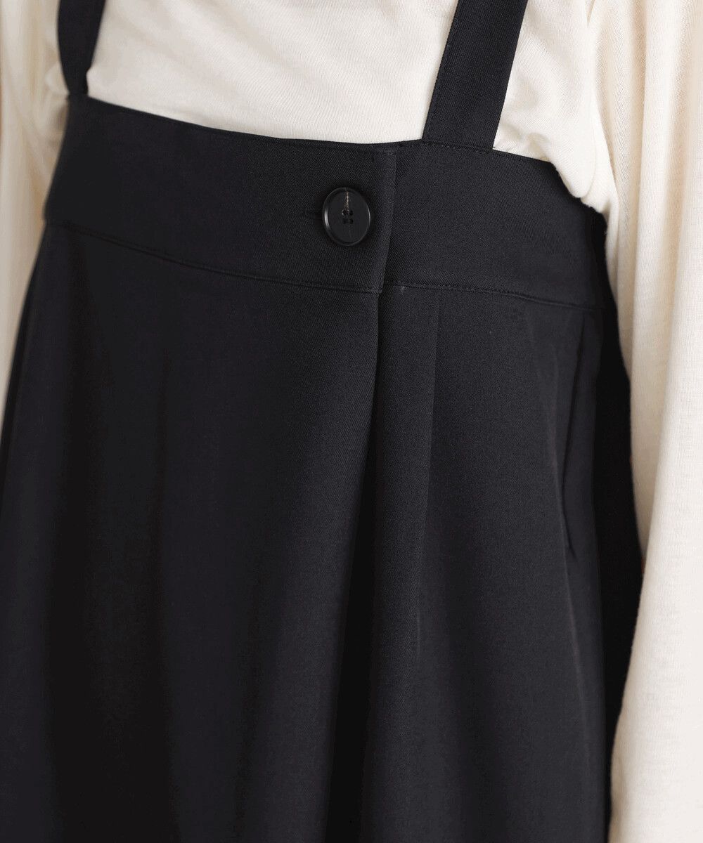 日本 Bab - 斜紋布優雅摺線工裝風吊帶裙-黑