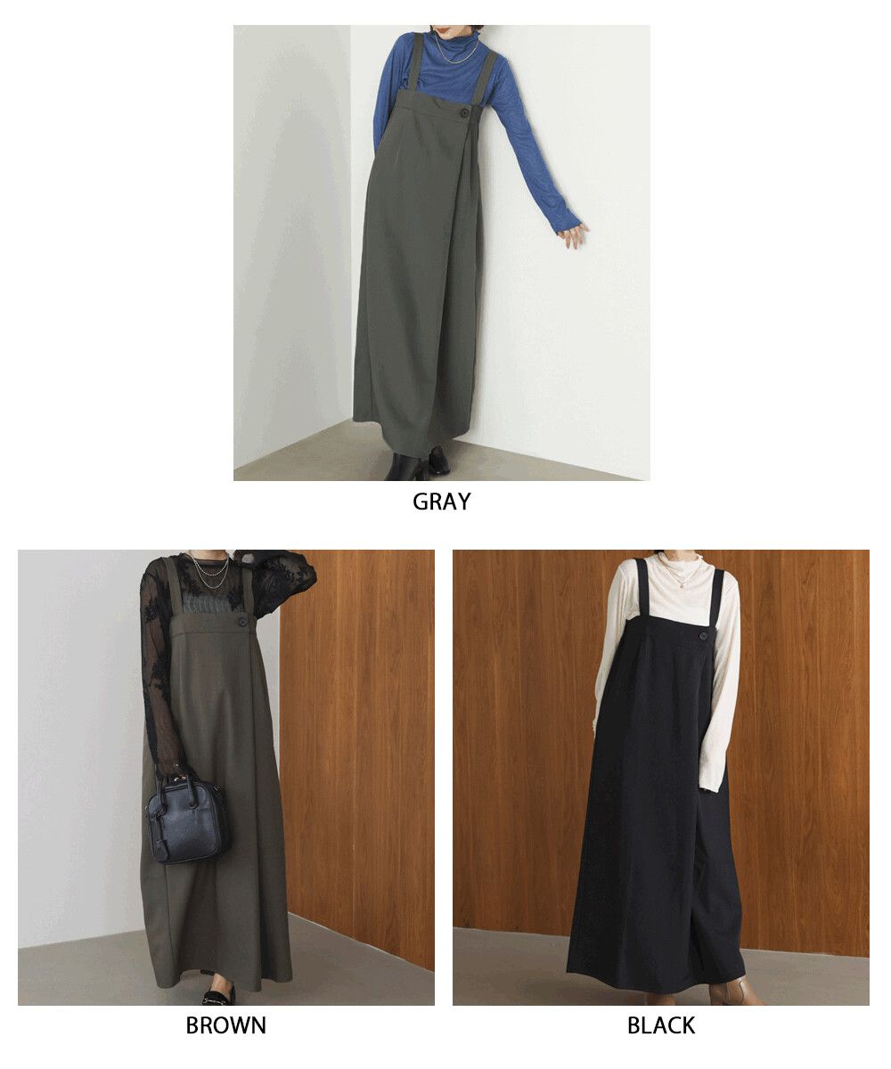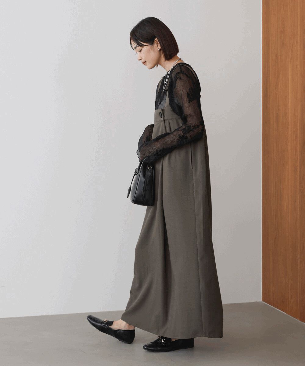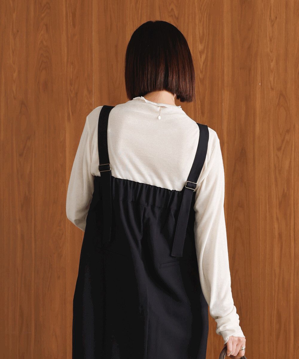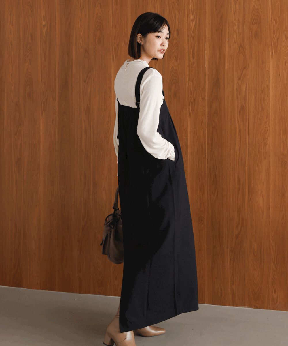 日本 Bab - 斜紋布優雅摺線工裝風吊帶裙-黑