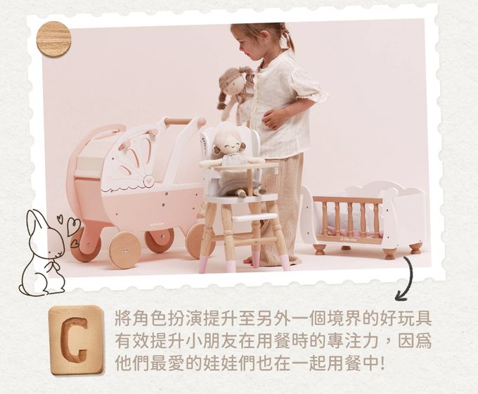 。將角色扮演提升至另外一個境界的好玩具、有效提升小朋友在用餐時的專注力,因為她們最愛的娃娃們也在一起用餐中!