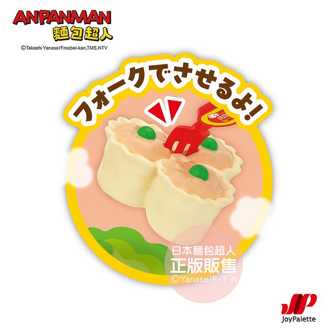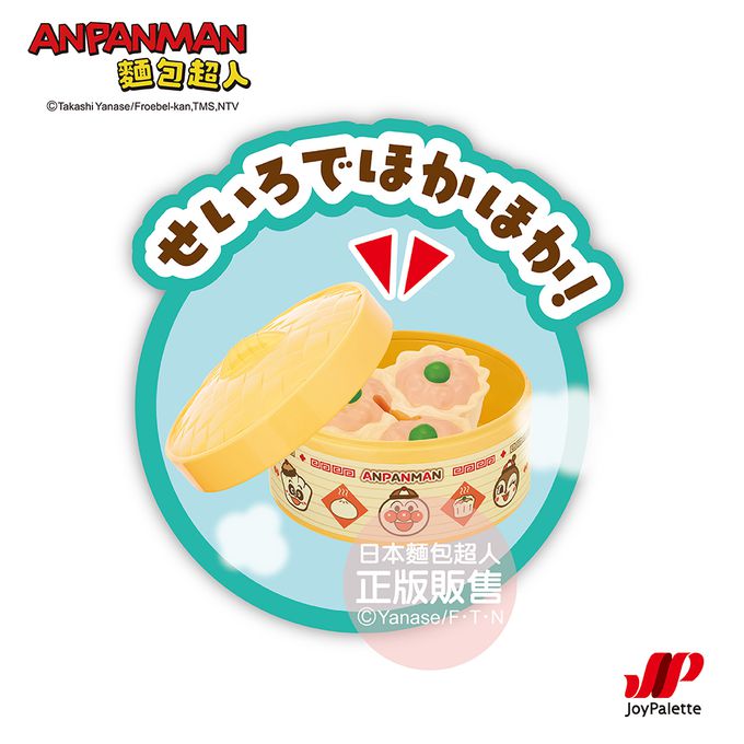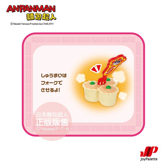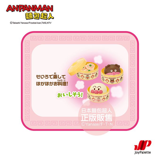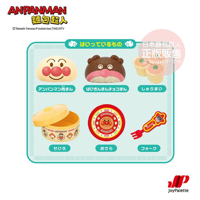 組合內容:麵包超人肉包、細菌人巧克力包、燒賣、蒸籠、餐盤、叉子