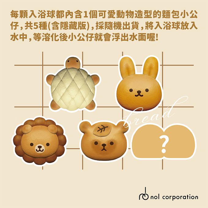 每顆入浴球都內含1個可愛動物造型的麵包小公仔,共5種(含隱藏版),採隨機出貨,將入浴球放入水中,等溶化後小公仔就會浮出水面喔! 會出現哪個呢? 一起來收集吧!