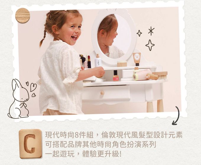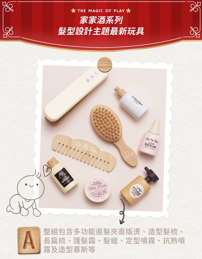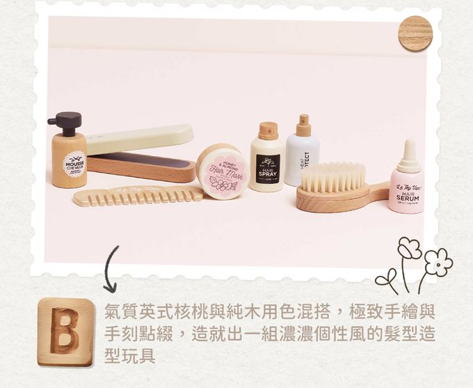 。氣質英式核桃與純木用色混搭,極致手繪與手刻點綴,造就出一組濃濃個性風的髮型造型玩具
