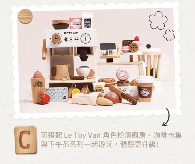 。可搭配 Le Toy Van 角色扮演廚房,咖啡市集與下午茶系列一起使用