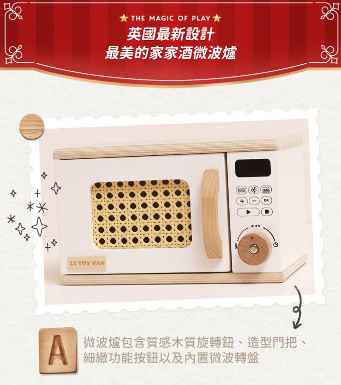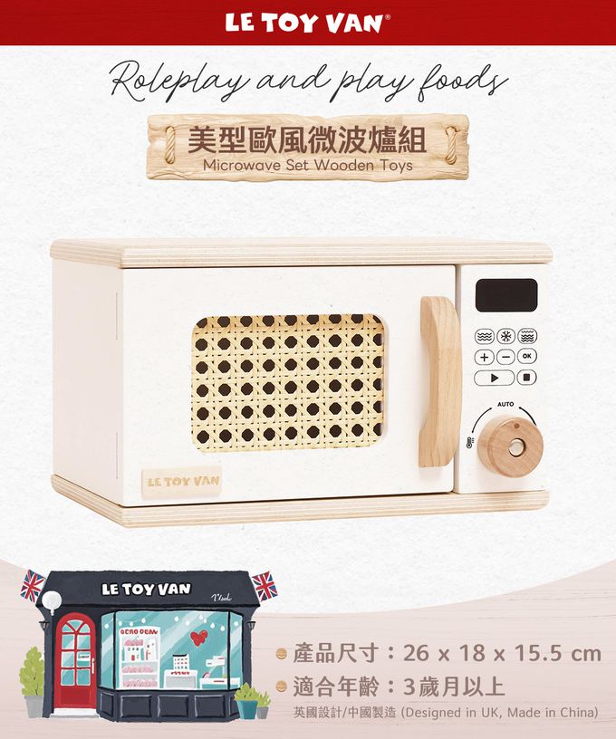 。英國最新設計, 最美的家家酒微波爐。純木質的視覺觸覺饗宴, 極致手工雕刻及彩繪細節。微波爐包含質感木質旋轉鈕、造型門把、細緻功能按鈕以及內置微波轉盤。不只是木質家家酒玩具, 更是居家裝飾的超美配件。最天然純木質玩具 響應愛護地球無塑膠概念。使用永續性的純橡膠木實木材質,安全無毒且關心地球。採用天然無毒漆,確保絕對的安全性。尺寸為: 26 x 18 x 15.5 cm。適合年齡: 3 歲以上。英國設計, 中國製造 (Designed in UK, Made in China)