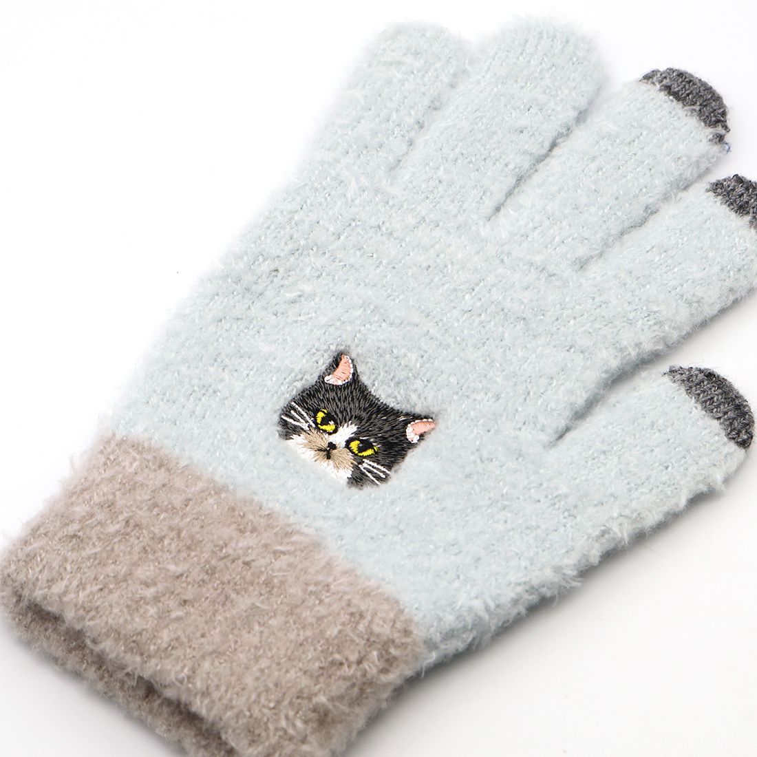 日本 TOMO - 大人可觸控短絨保暖手套-貓咪-薄荷藍