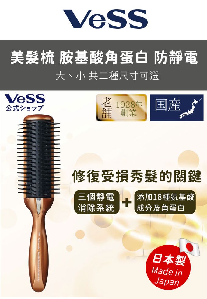【VESS】日本製美髮梳,梳齒含胺基酸與角蛋白塗層,使用時能降低靜電並減少毛躁,使頭髮更順暢。圓潤齒梳貼合頭皮,梳理時舒適不拉扯。日本製造品質穩定,設計輕巧好握,適合日常梳理與吹整造型。