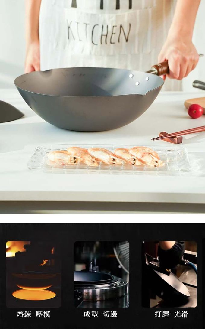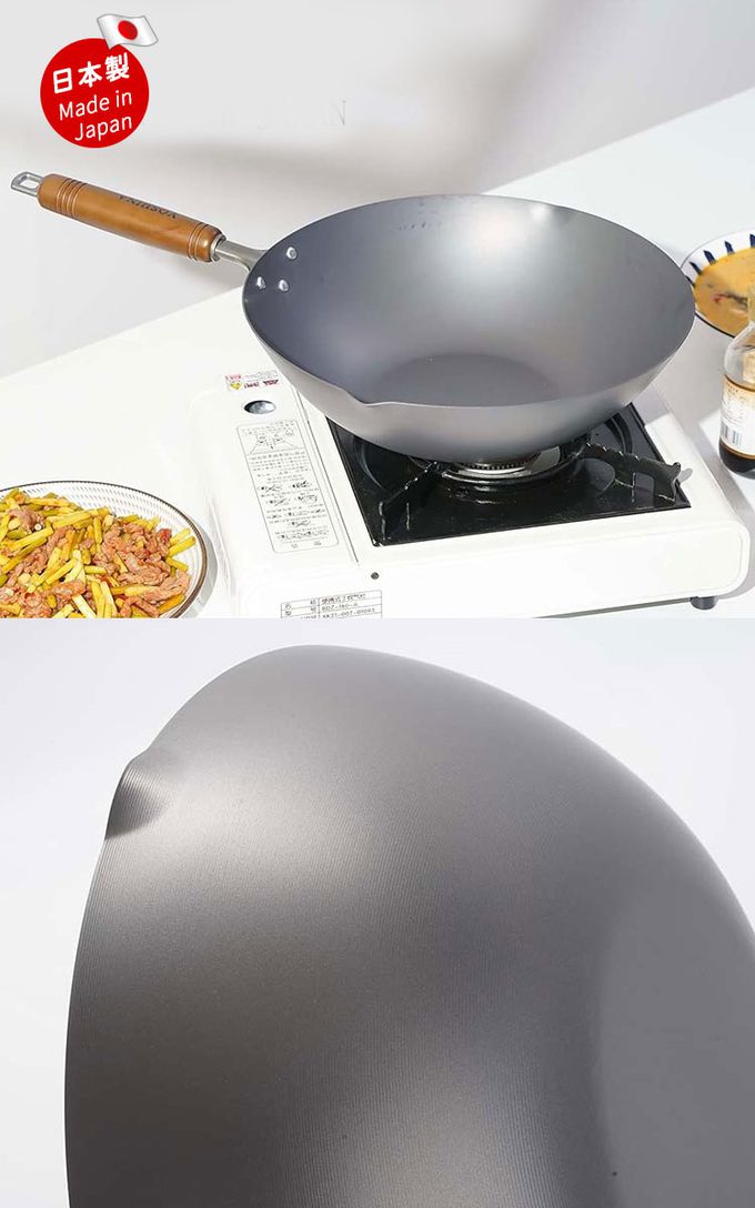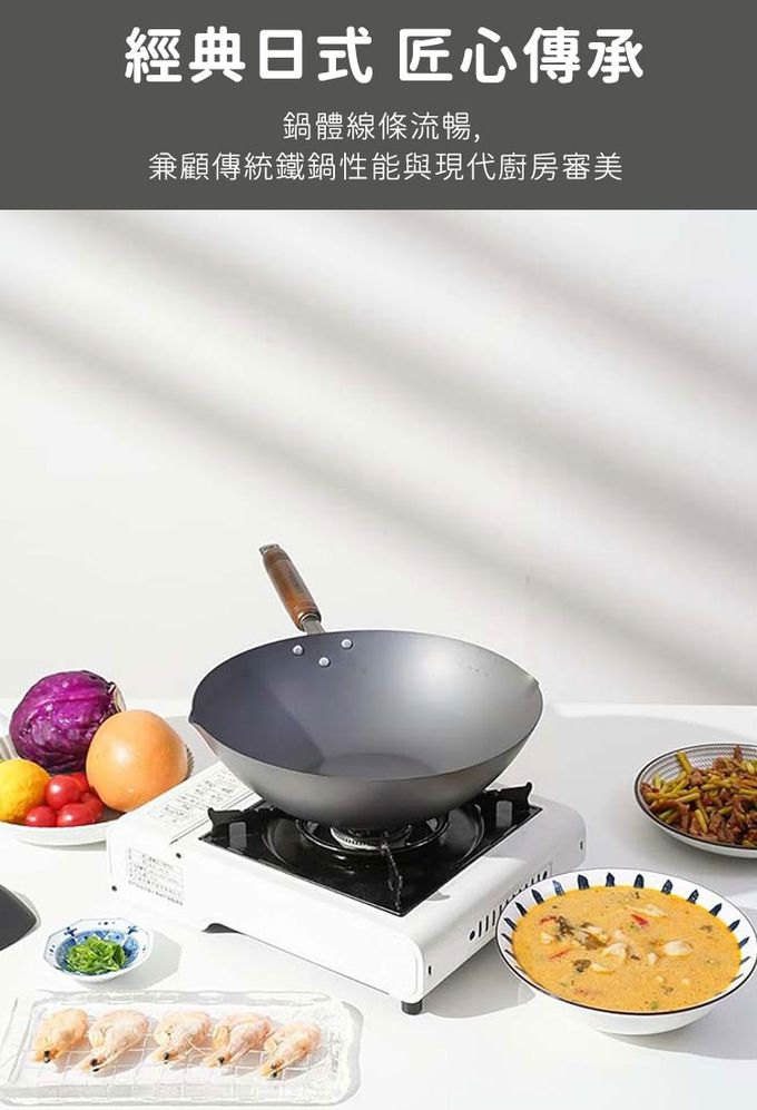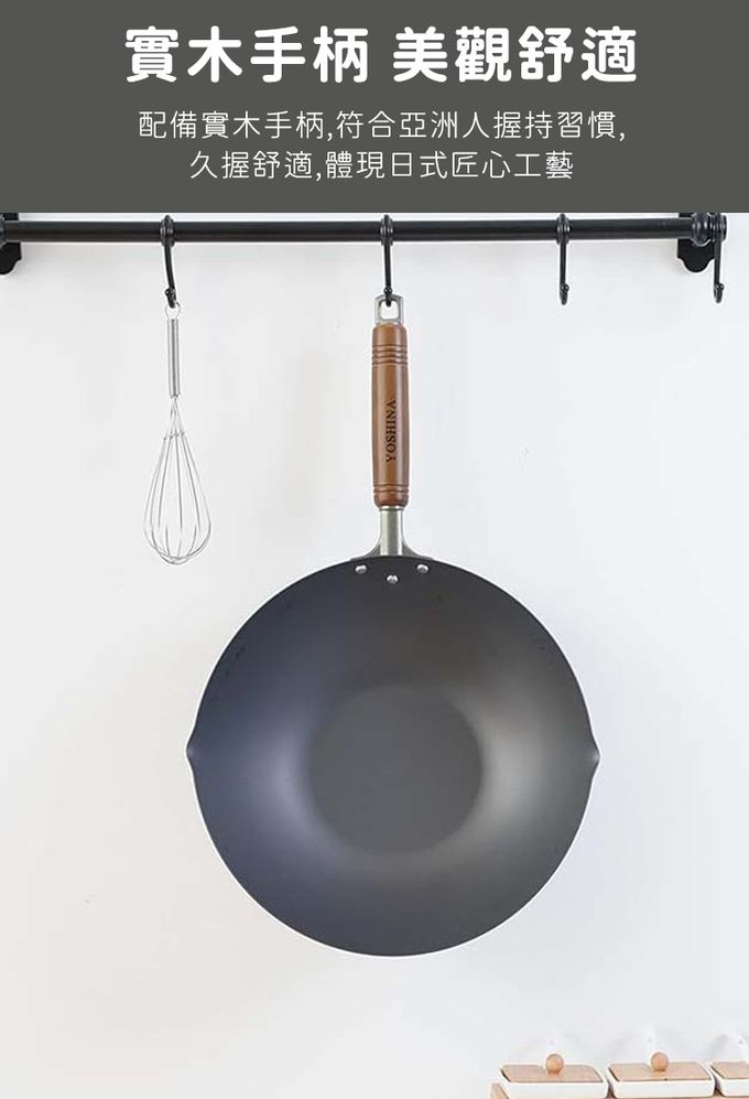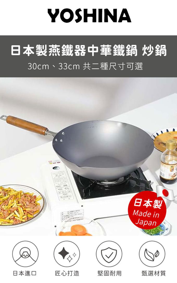 【日本YOSHINA】日本製燕鐵器中華鐵鍋,由日本新潟縣燕三條地區職人製造。選用高純度鐵材打造,導熱快速、受熱均勻,適合中式料理中的快炒、煎、炸等用途。無塗層設計可耐高溫烹調,使用後經養鍋能形成自然油膜,使鍋具更耐用、不易沾黏。