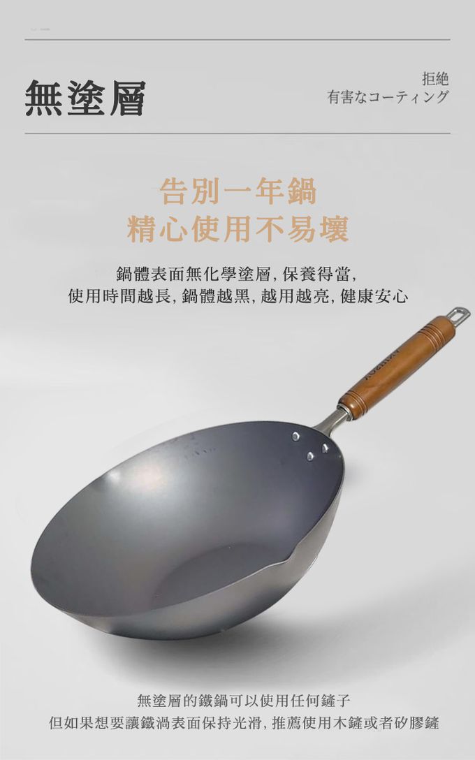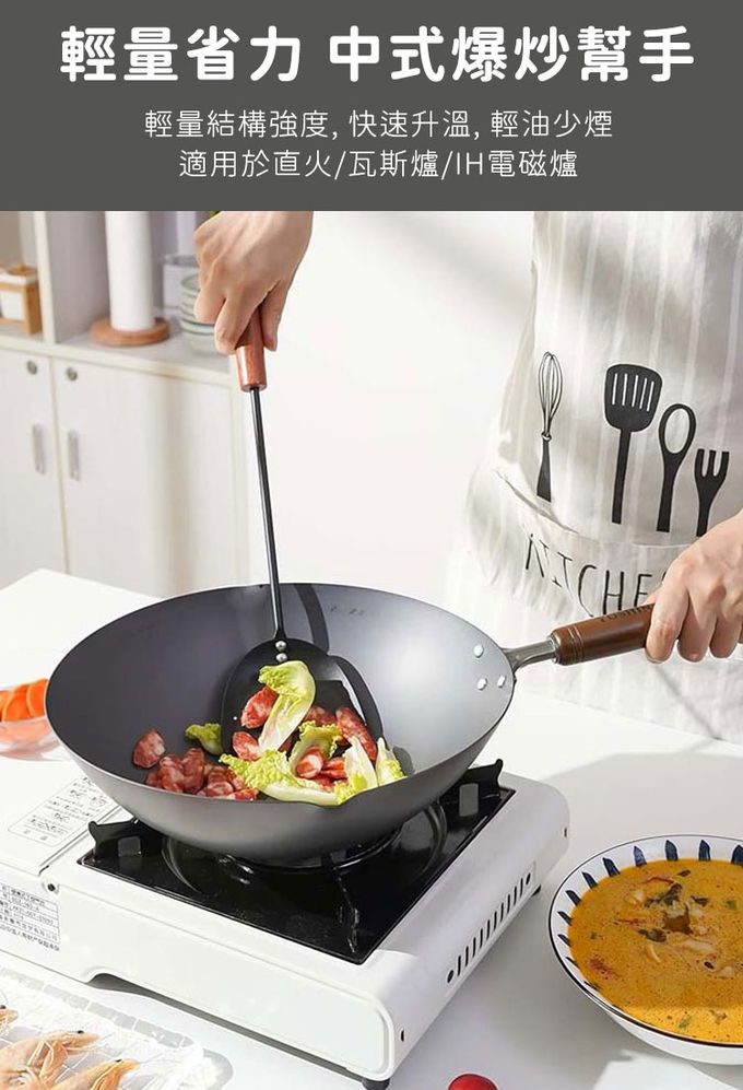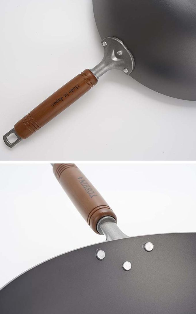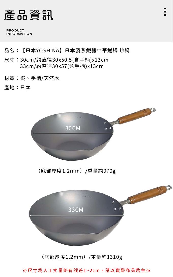 【日本YOSHINA】日本製燕鐵器中華鐵鍋,由日本新潟縣燕三條地區職人製造。選用高純度鐵材打造,導熱快速、受熱均勻,適合中式料理中的快炒、煎、炸等用途。無塗層設計可耐高溫烹調,使用後經養鍋能形成自然油膜,使鍋具更耐用、不易沾黏。