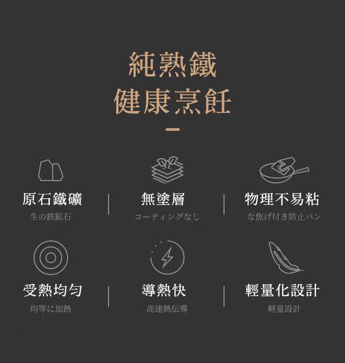高純度鐵材導熱快、蓄熱佳,適合多樣料理。