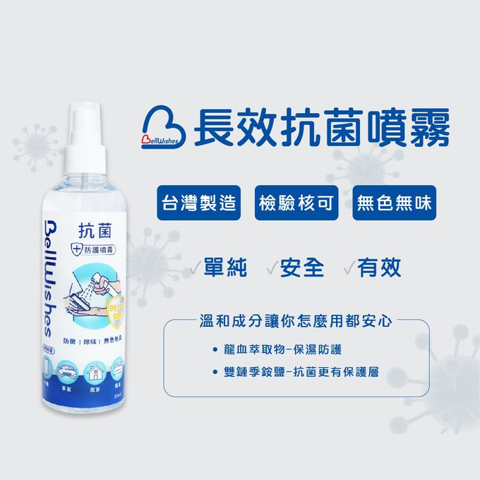 商品成分:雙鏈季銨鹽、天然亮肽、龍血素萃取、純水、BellWishes 48H長效抗菌噴霧