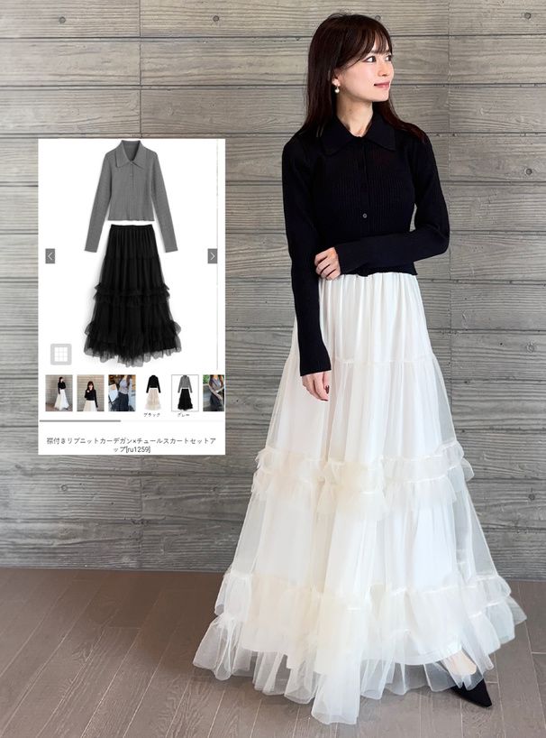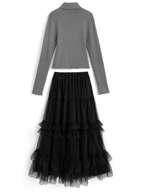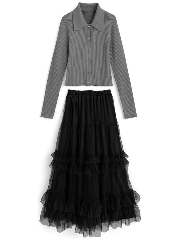 日本 GRL - 羅紋針織開襟上衣+蓬蓬紗裙(2件式套裝)-灰x黑 (F)