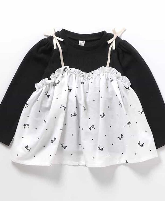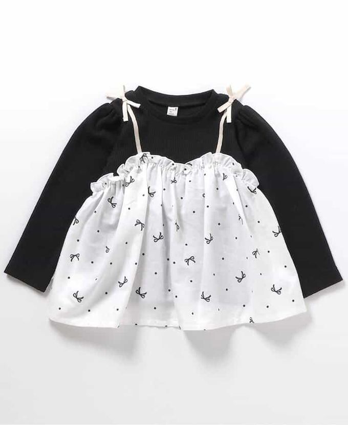 日本 apres les cours - 假兩件吊帶華夫格長袖上衣-蝴蝶結-黑X白