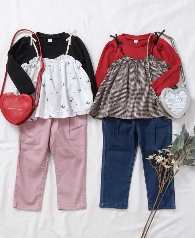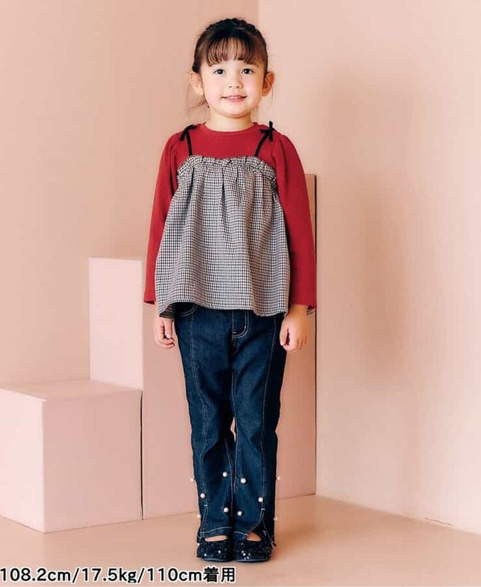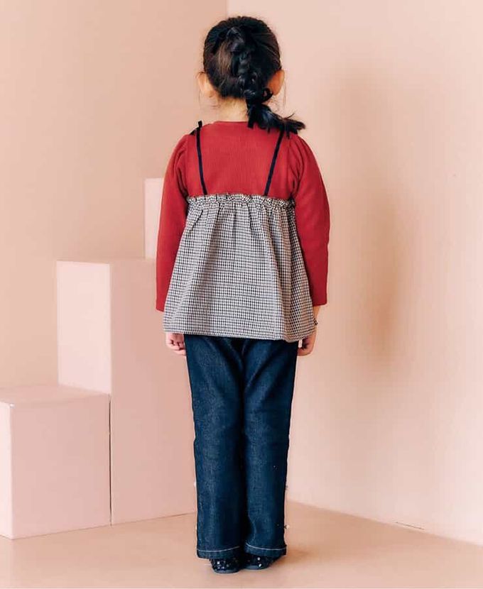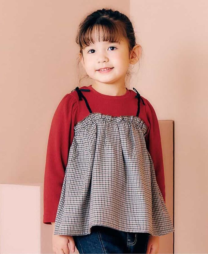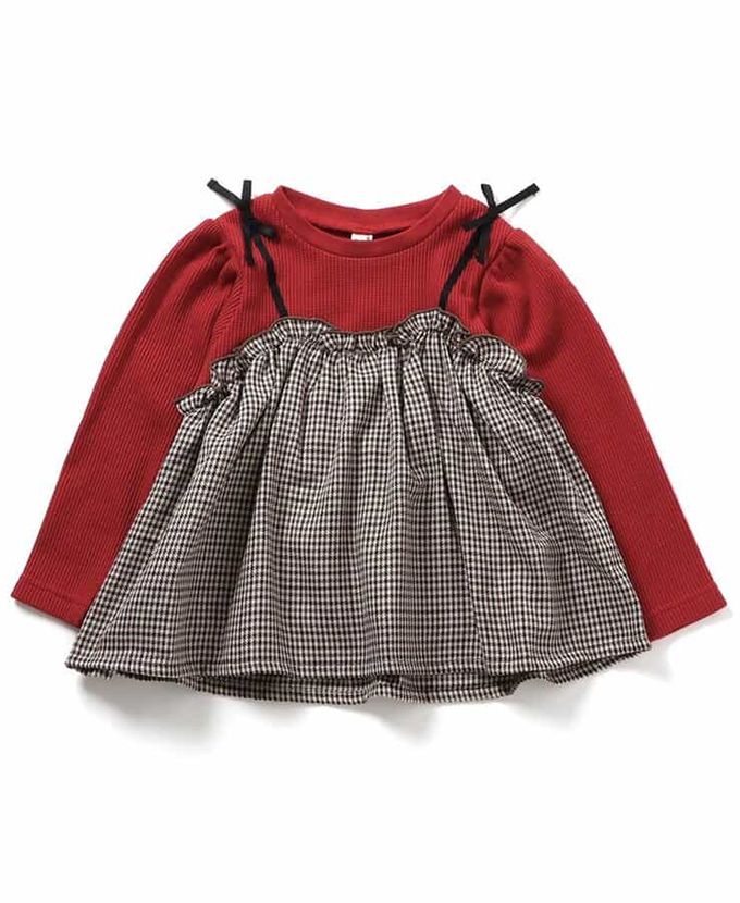 日本 apres les cours - 假兩件吊帶華夫格長袖上衣-格子-紅X棕