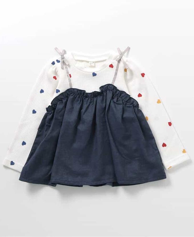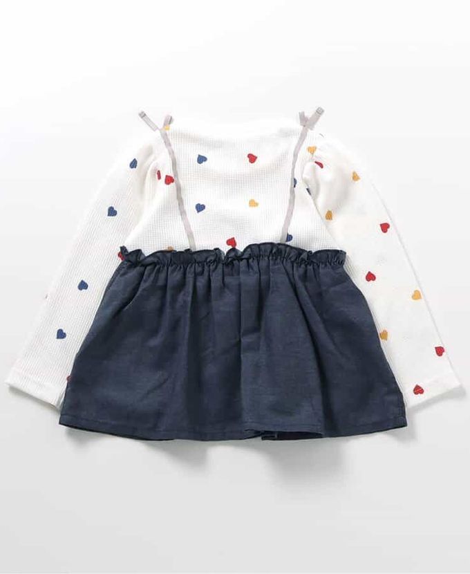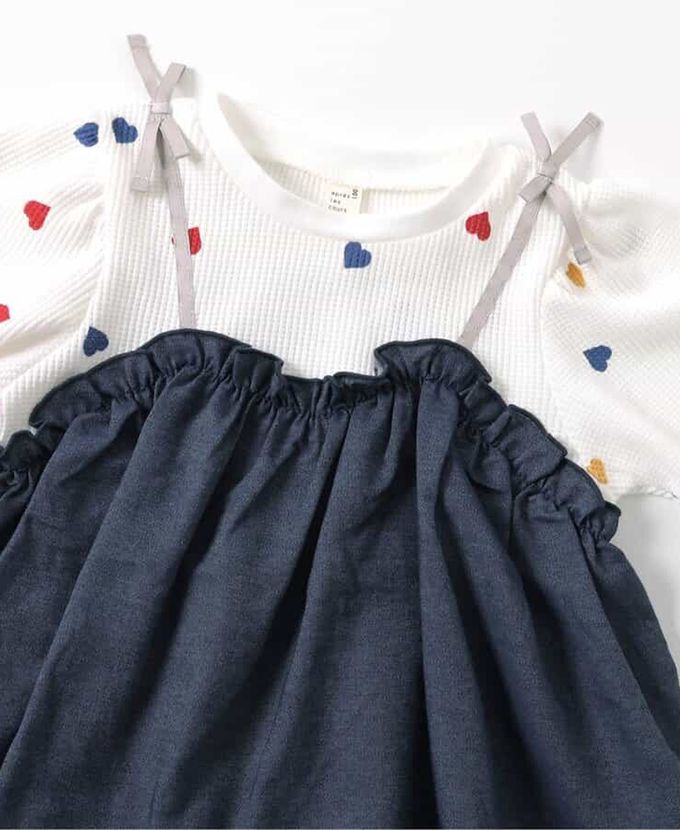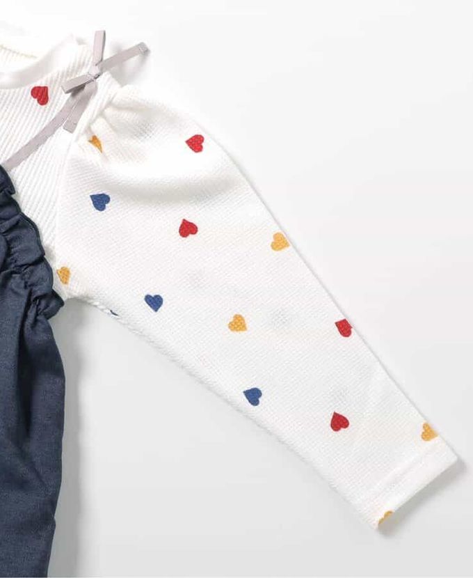 日本 apres les cours - 假兩件吊帶華夫格長袖上衣-彩色愛心-白X丹寧藍