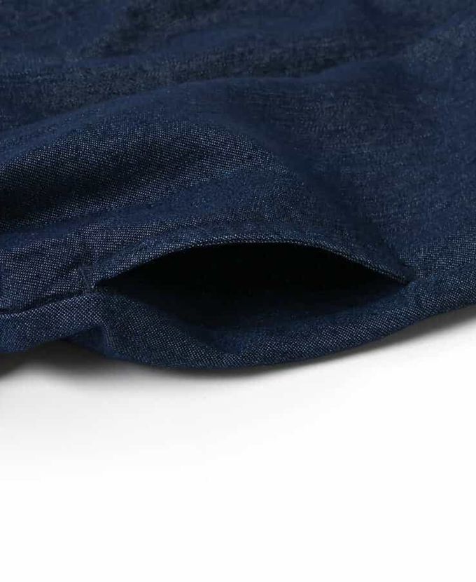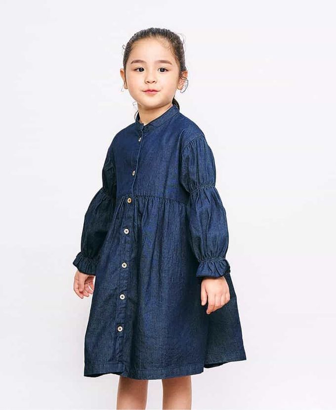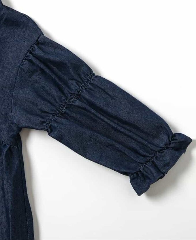 日本 apres les cours - 可愛花苞袖鈕扣長袖洋裝-素面-丹寧藍