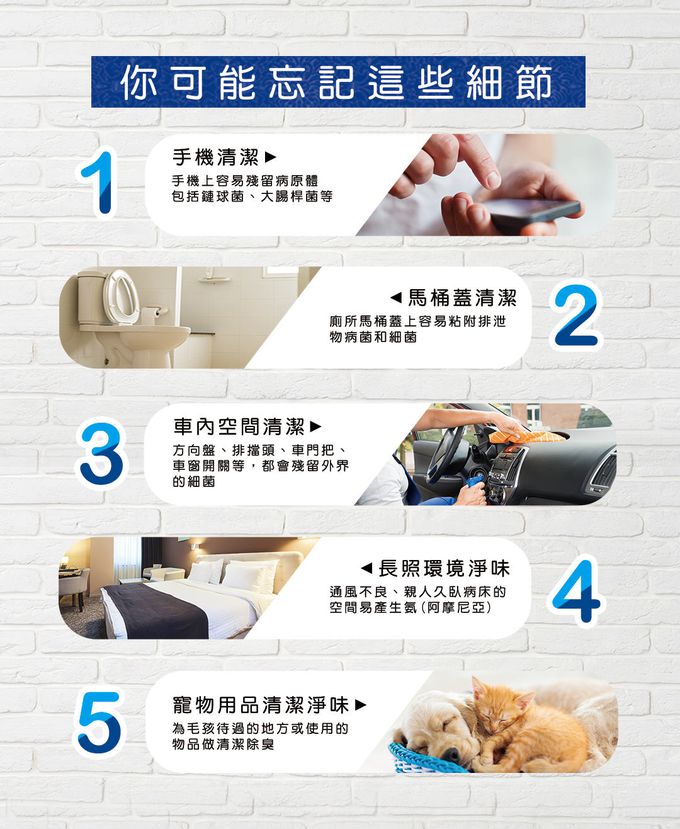 適用於口罩、衣物、鍵盤、門把、馬桶、床鋪、地毯等居家/車內空間。