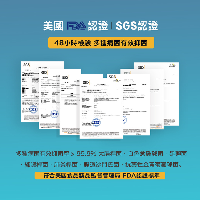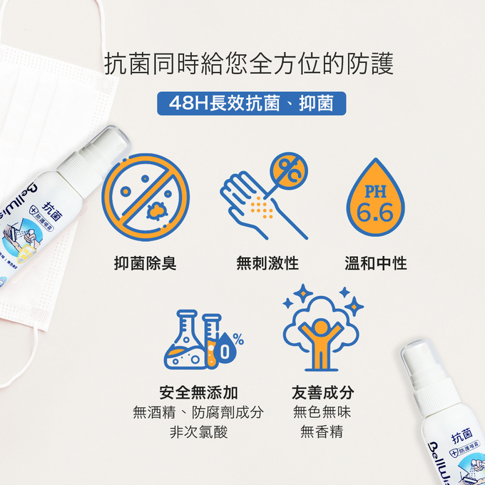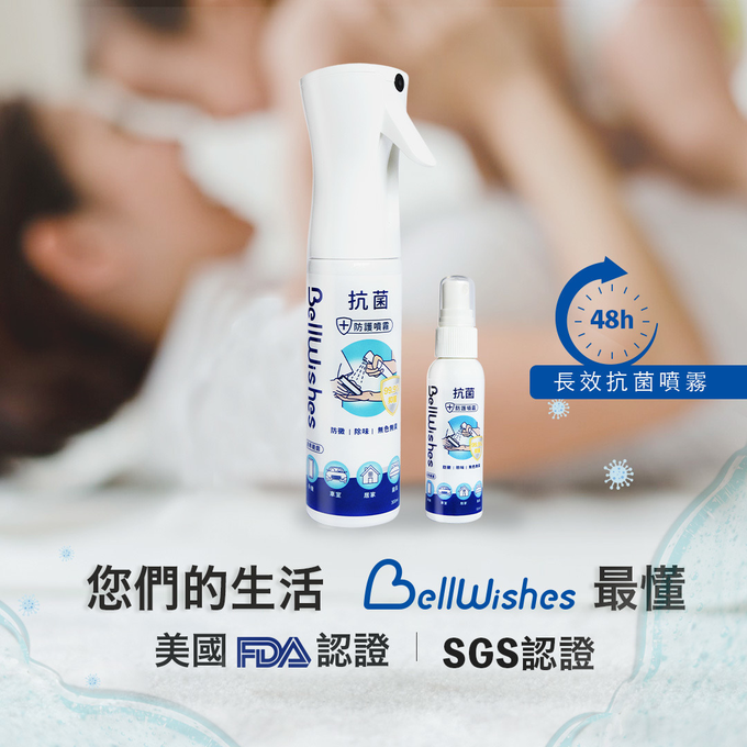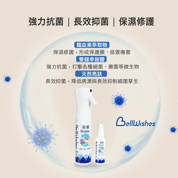 商品成分:雙鏈季銨鹽、天然亮肽、龍血素萃取、純水、BellWishes 48H長效抗菌噴霧